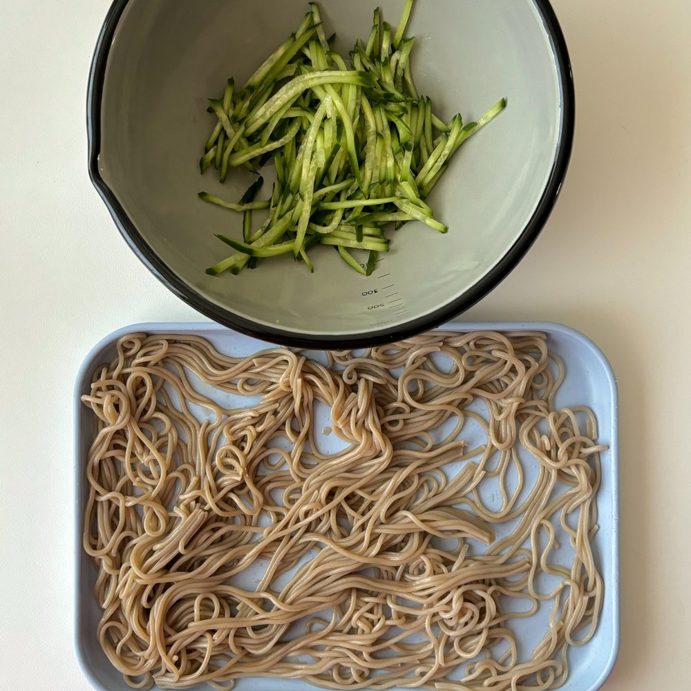메밀 김밥을 싸기 전, 제일 먼저 준비해야 하는 재료는 메밀면이에요. 메밀면 50g을 끓는 물에 3분간 익혀준 뒤, 찬물에 충분히 헹궈 물기를 최대한 제거해요. 간장 또는 쯔유 1티스푼, 알룰로스 1티스푼을 넣고 잘 버무려주세요.