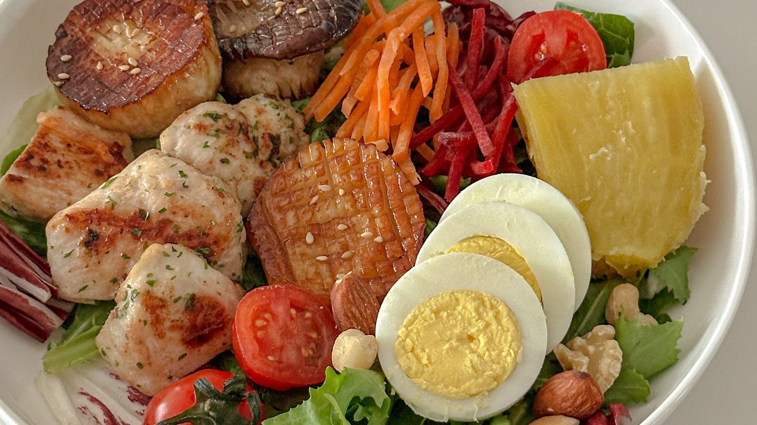 • 토핑 : 잎채소, 닭가슴살, 새송이버섯구이, 찐 고구마, 삶은 계란, 토마토, 당근채, 비트채, 견과류