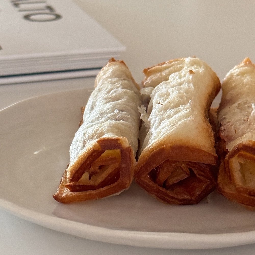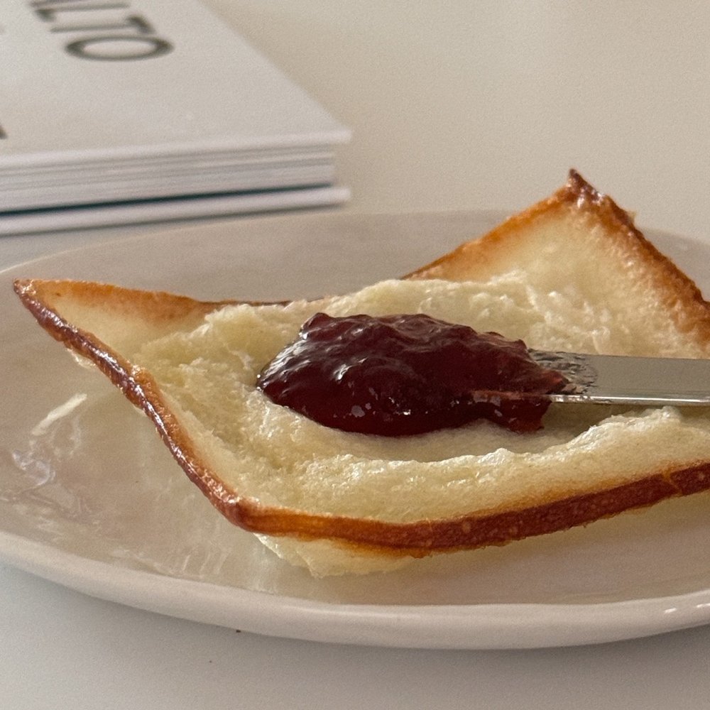 티슈 브레드는 페이스트리 느낌의 겉은 바삭하고 속은 촉촉한 식빵을 한 겹 한 겹 떼어먹는 재미가 정말 좋은데요, 이 한 겹의 얇은 식빵 위에 취향에 맞는 잼이나 과일을 곁들여 먹으면 아주 맛있답니다. 저는 최애 잼 브랜드 본 마망의 달콤한 딸기잼과 사과를 얇게 슬라이스한 후 그 위에 피넛버터를 잔뜩 올려 함께 먹었답니다. 피넛버터와 사과의 조합을 사랑하는 것 또한 화정 언니와 저의 공통점!