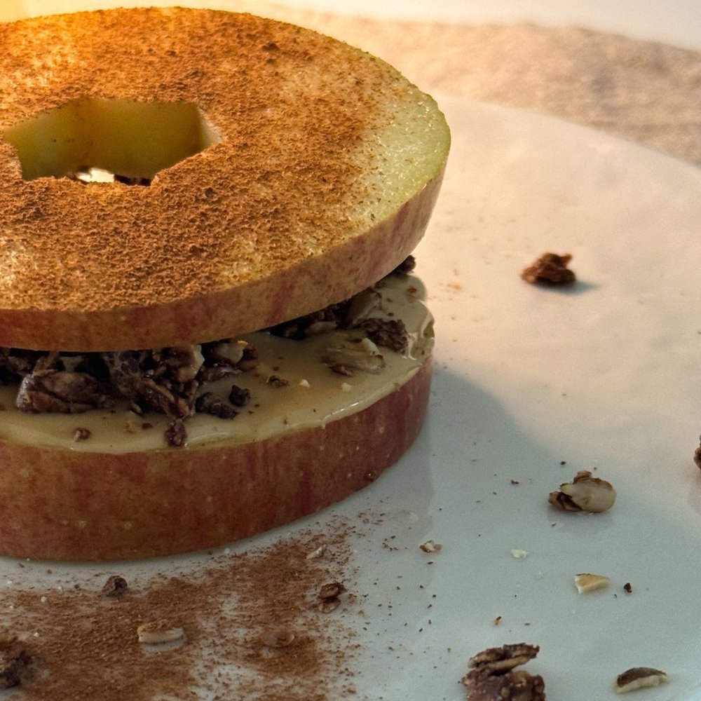 3. 마지막으로 그래놀라를 피넛버터 위에 뿌려준 후 사과를 올려줍니다.