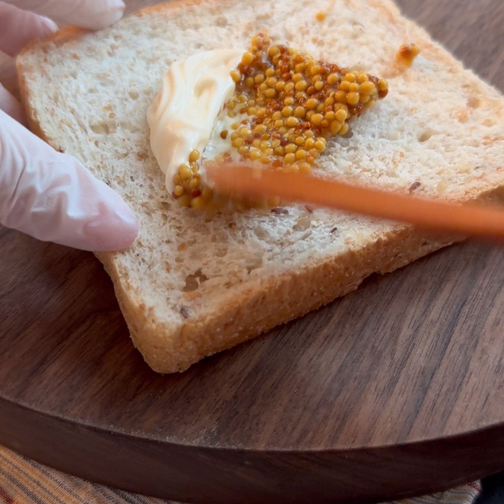 1. 호밀빵의 한쪽 면에 마요네즈 1t와 홀그레인 머스터드 1t을 바릅니다.