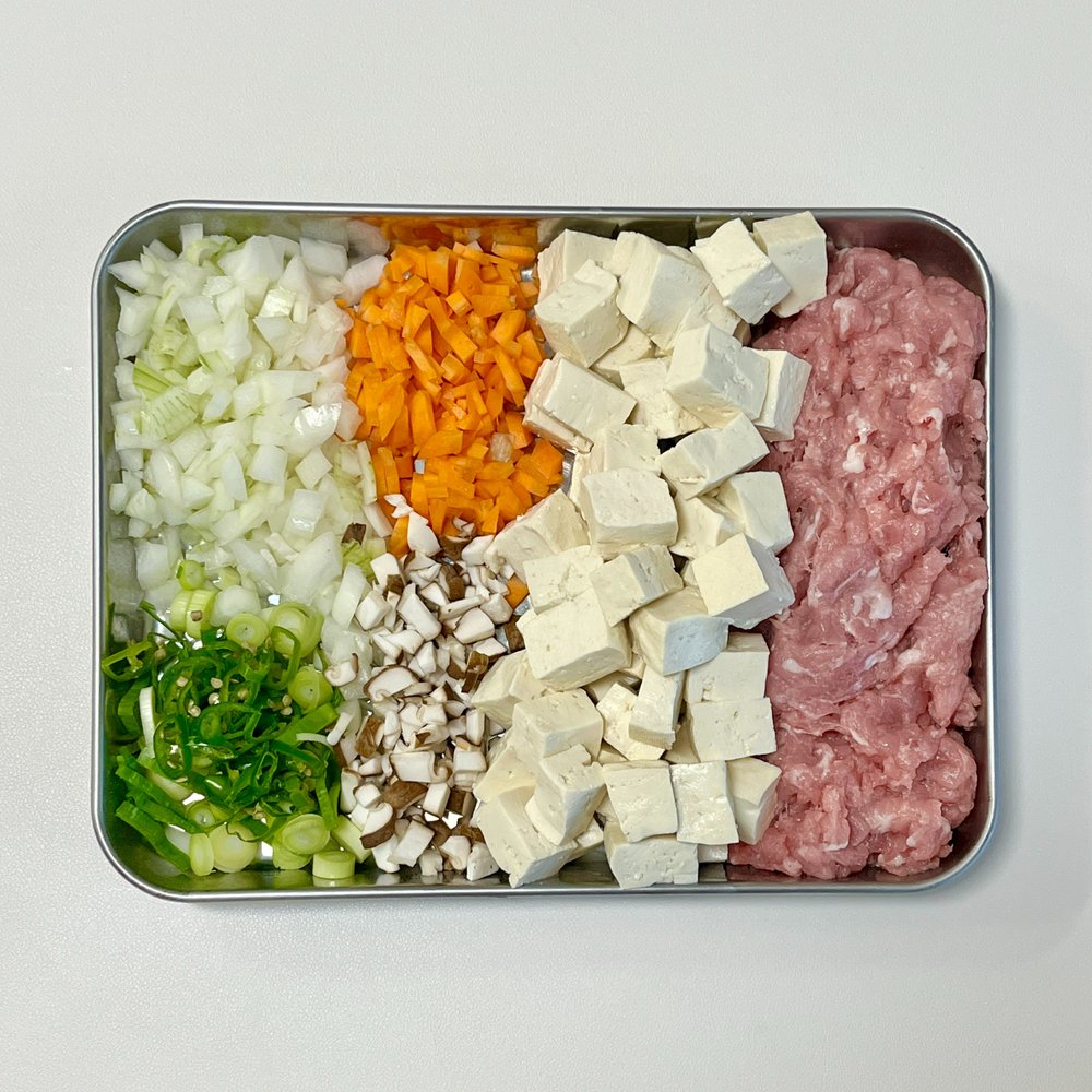 : 돼지고기 다짐육, 두부, 양파, 당근, 표고버섯, 청양고추, 대파