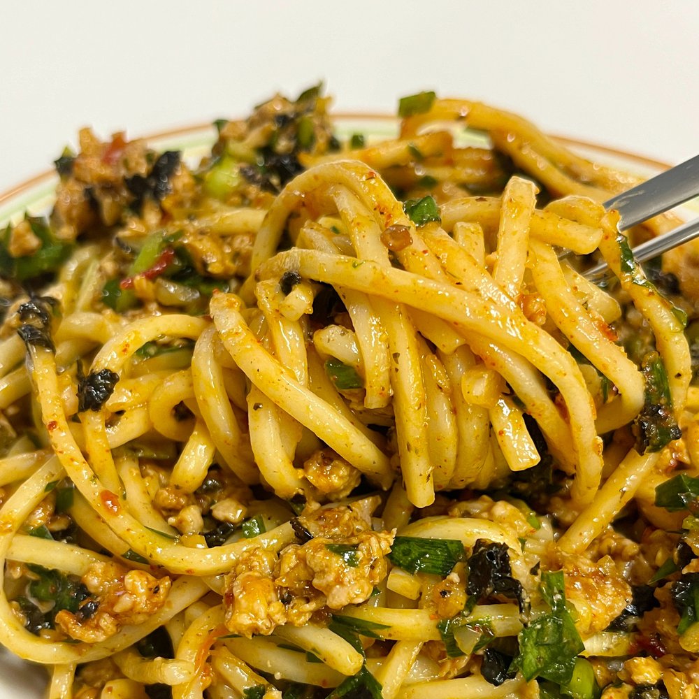 5. 면 삶고 찬물에 헹군 뒤 그릇에 면 올리고 고추기름 2 뿌려주기