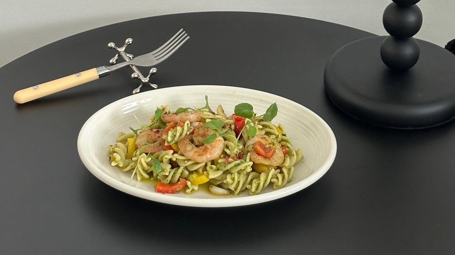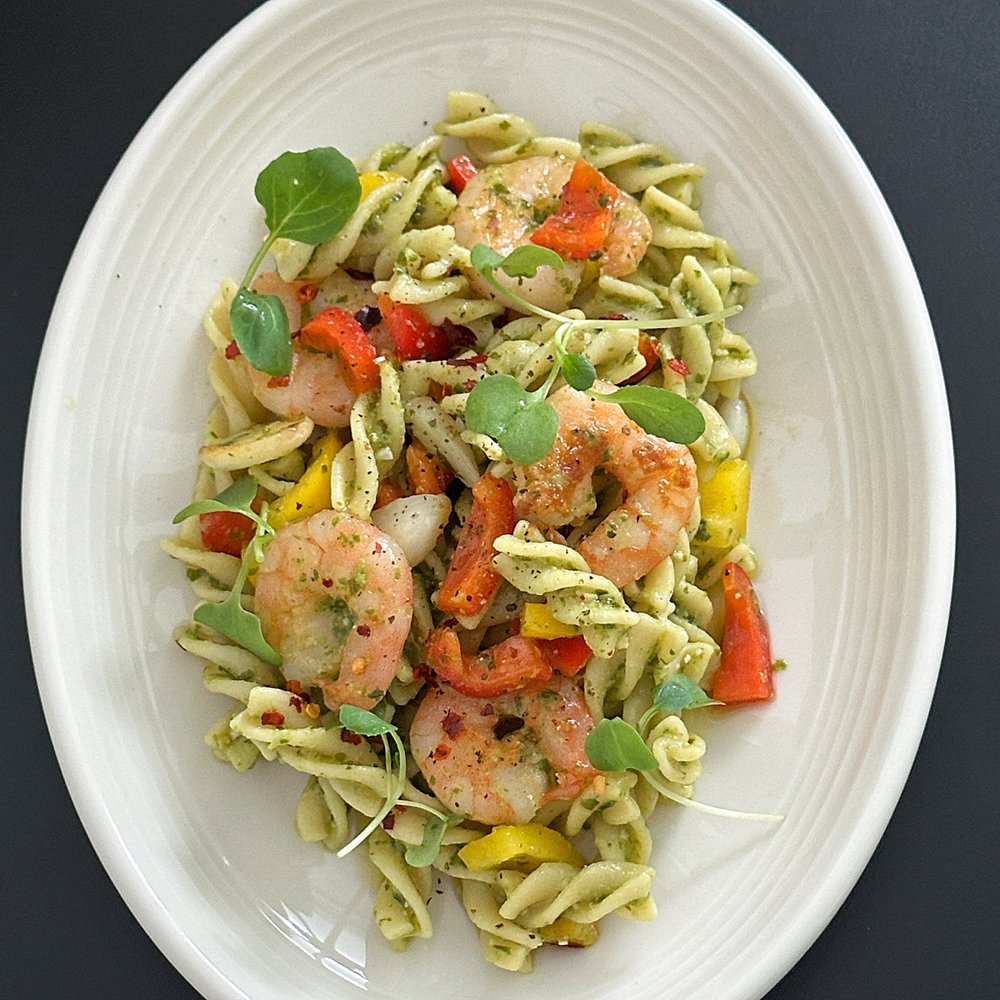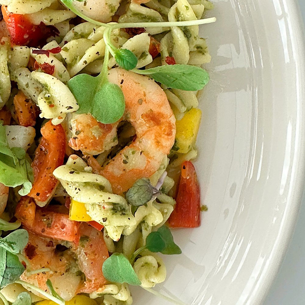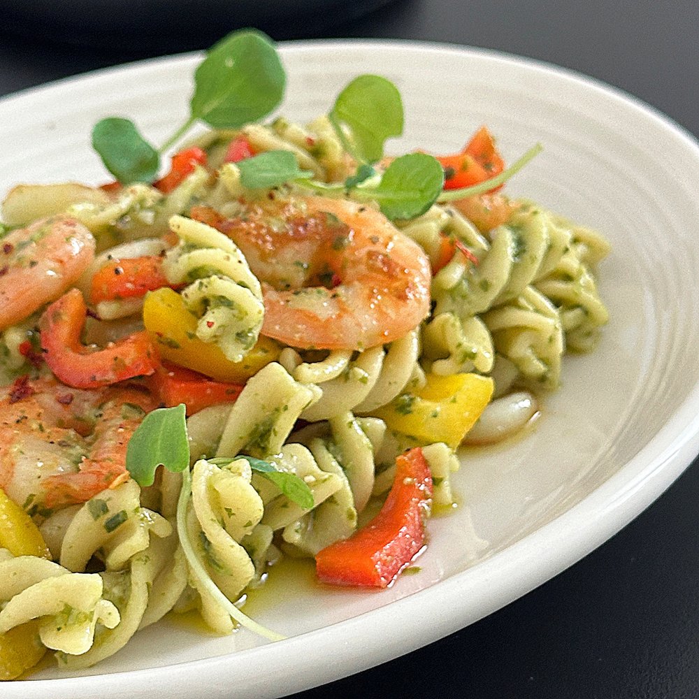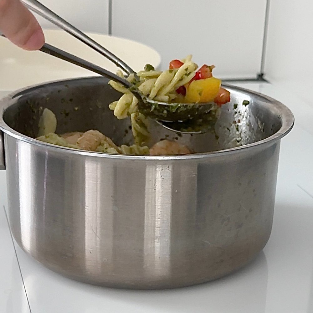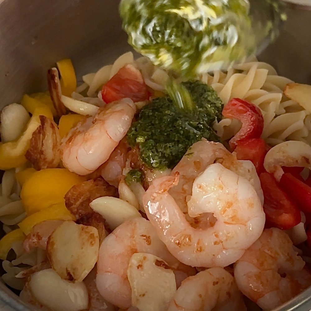 4. 삶은 푸실리는 면수는 3숟가락 정도 남긴 채로 파프리카와 구운 새우, 마늘을 넣어주고 바질 페스토는 3-4 숟가락 정도 넣어 모두 섞어주세요. (간은 취향껏)