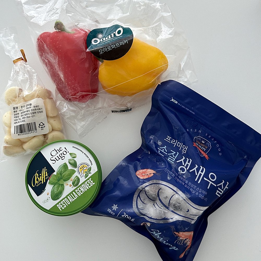 푸실리는 삶고 새우랑 편마늘은 굽고 채소는 썰어서 모두 합친 다음 바질 페스토를 넣어 섞어주면 끝!