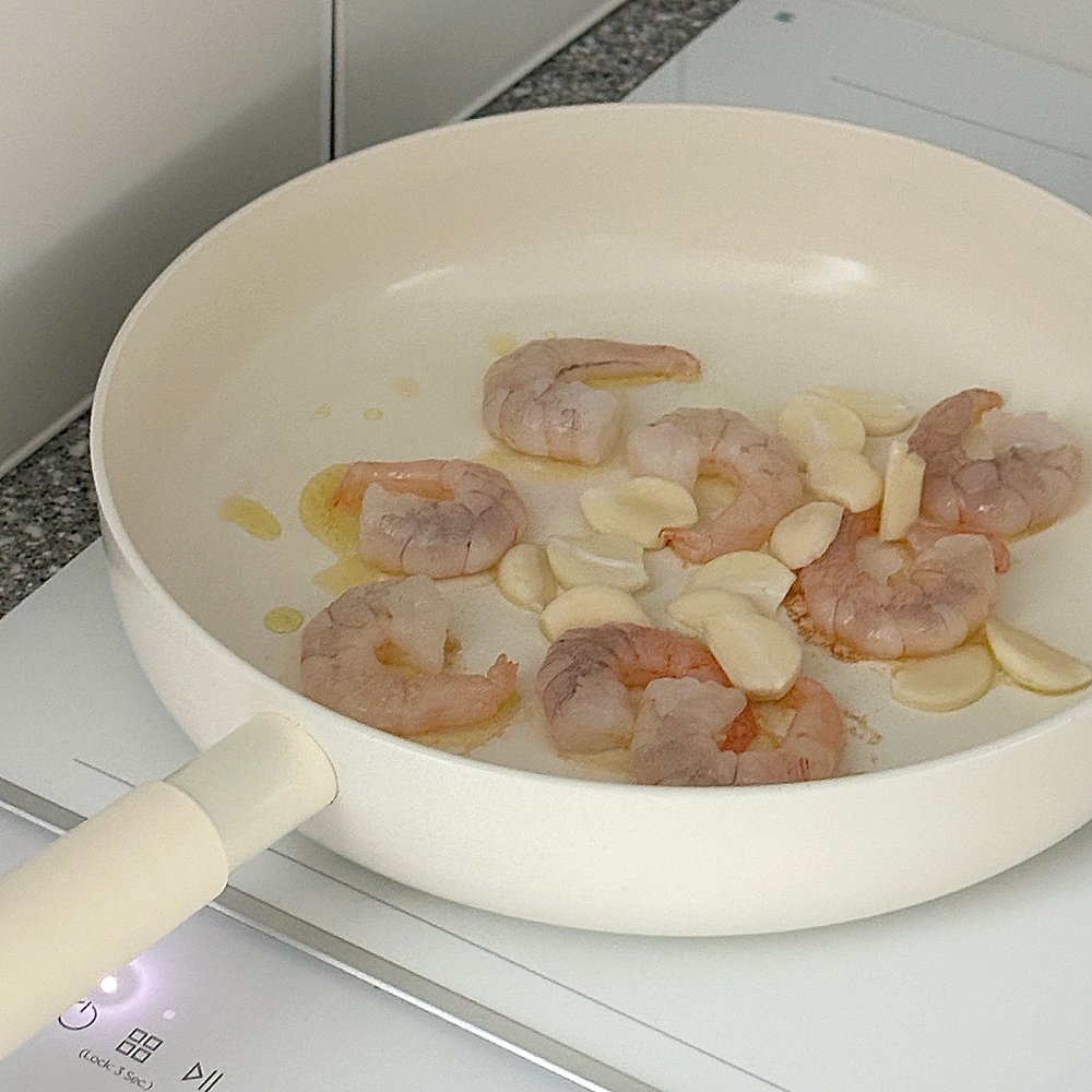 3. 팬에 올리브오일을 두르고 해동하여 물기 뺀 새우와 편마늘을 익혀줍니다.