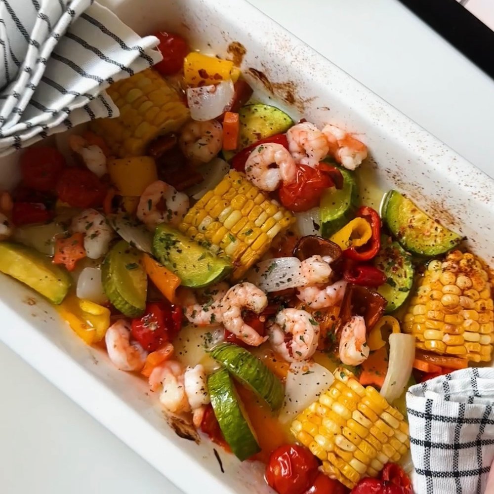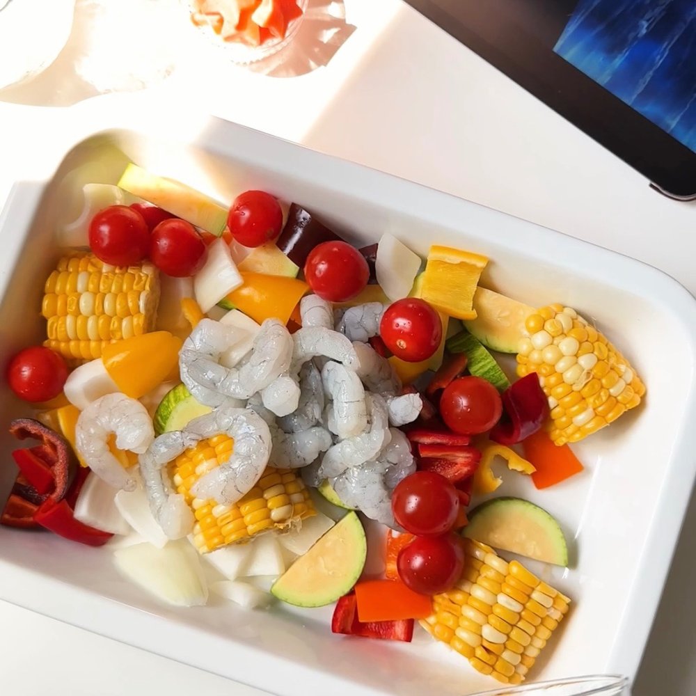 여름에 만날 수 있는 다양한 채소들을 한 입 크기로 잘라서 새우와 함께 시즈닝 합니다. 200도 오븐에 (에프 가능) 10분씩 두 번 돌리면 완성!