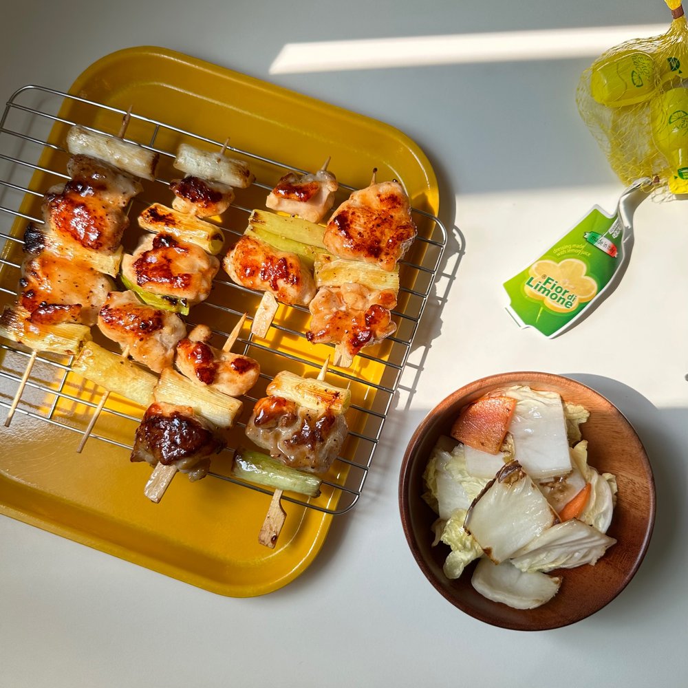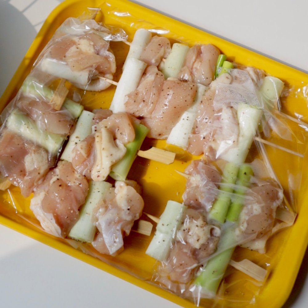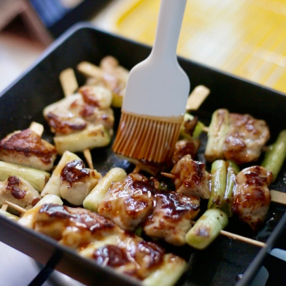 1. 닭다리살과 대파를 번갈아 가며 꼬치에 꽂아 팬에 노릇하게 익힙니다