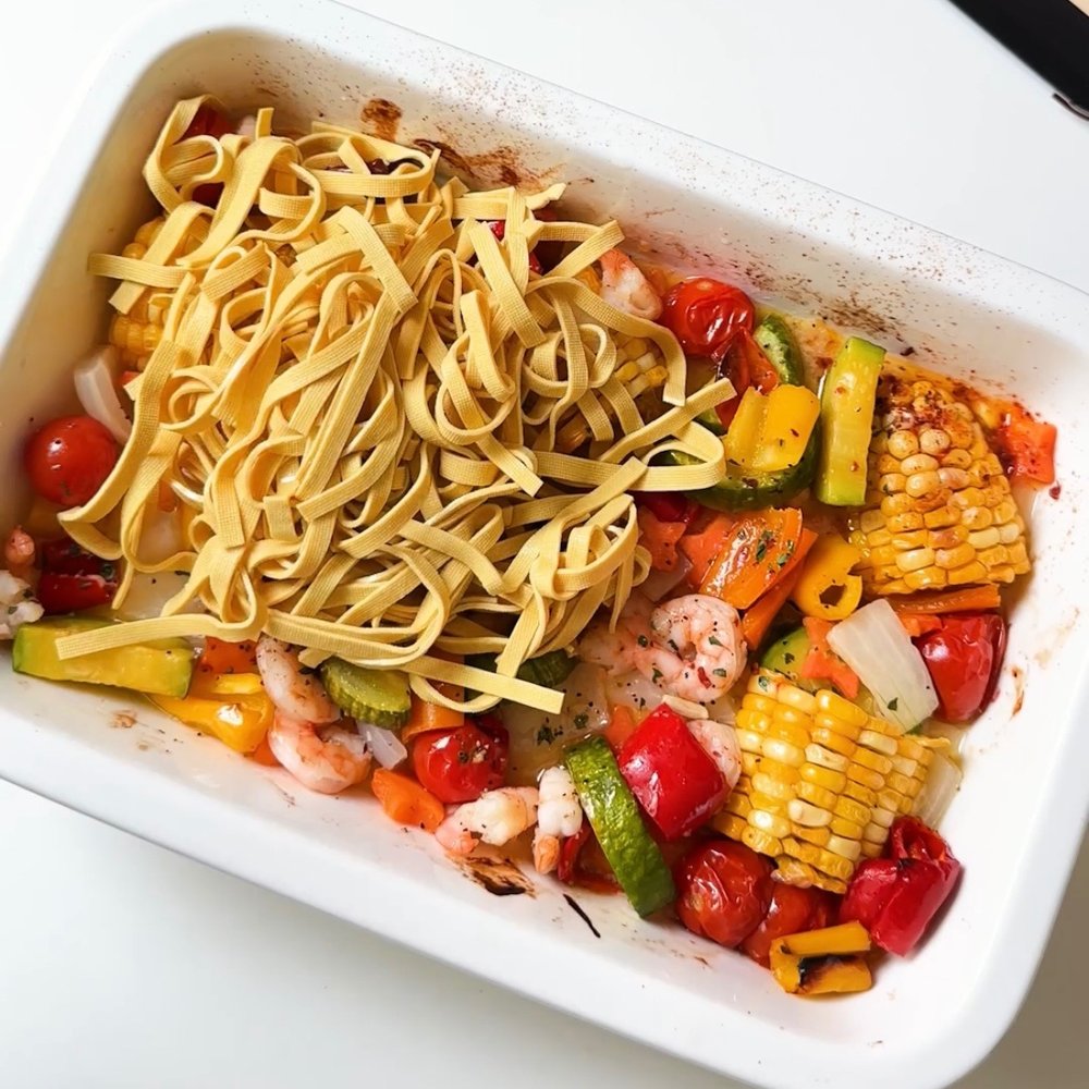 2. 오븐용 트레이에 채소와 새우 등을 담고 올리브오일과 소금 후추 시즈닝 해줍니다