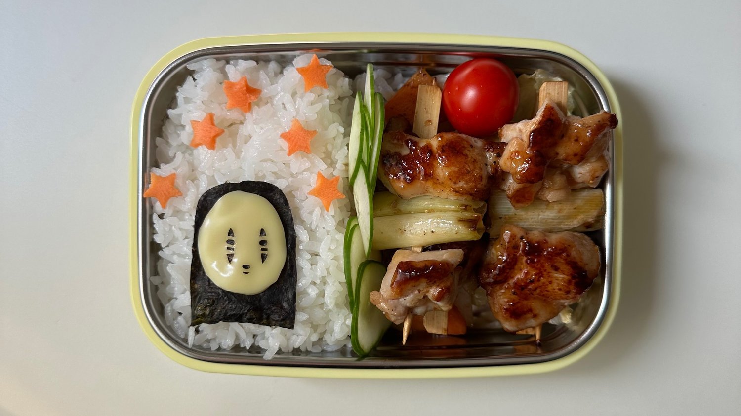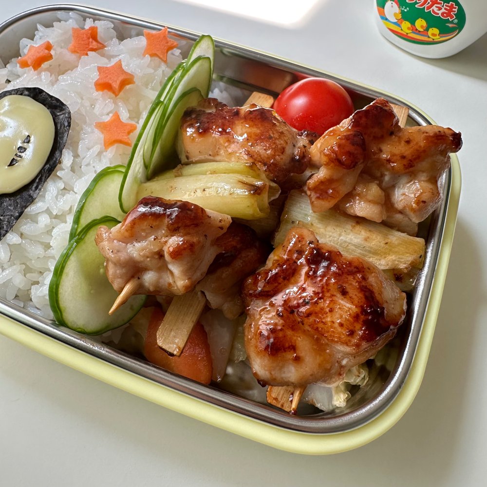 3. 도시락에 밥과 볶은 배추를 담고 (혹은 원하는 샐러드) 익힌 대파 닭꼬치를 담아 줍니다