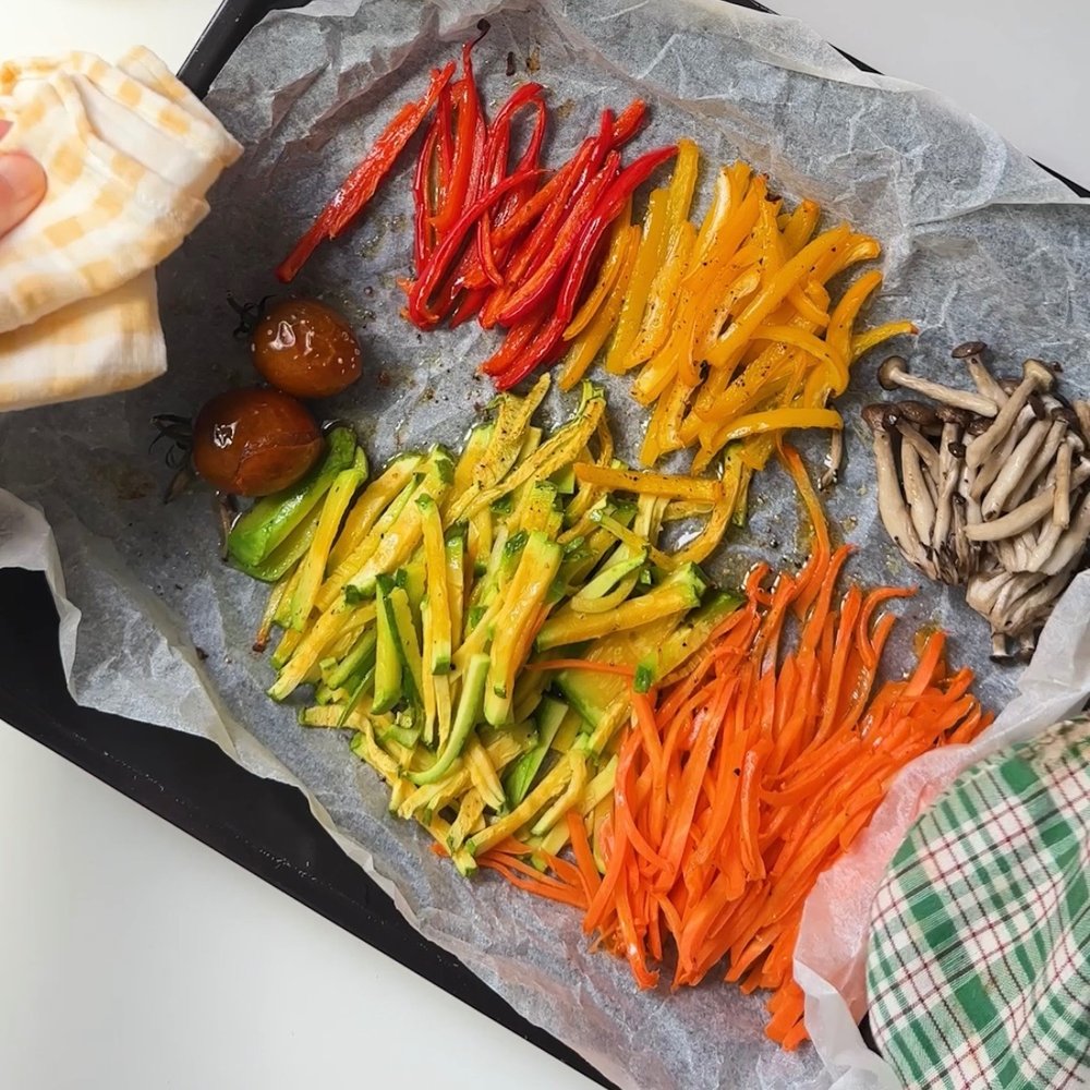 3. 180도 예열된 오븐 (에어프라이어 가능)에 채소의 숨이 살짝 죽을 정도로 익혀 주세요 (20~30분 소요)