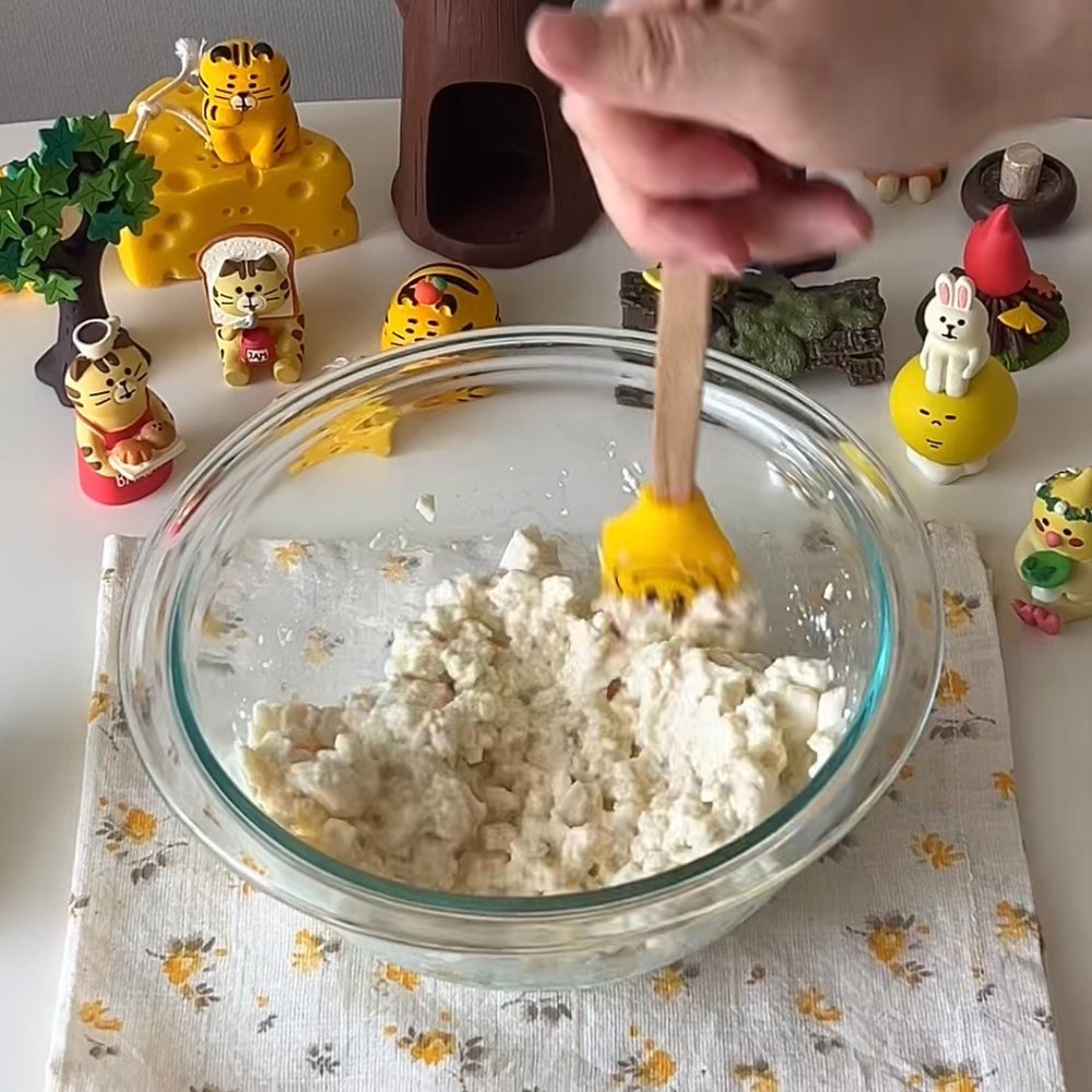 1. 순두부를 잘 으깨주고 감자전분 3T를 넣고 잘 섞어주세요