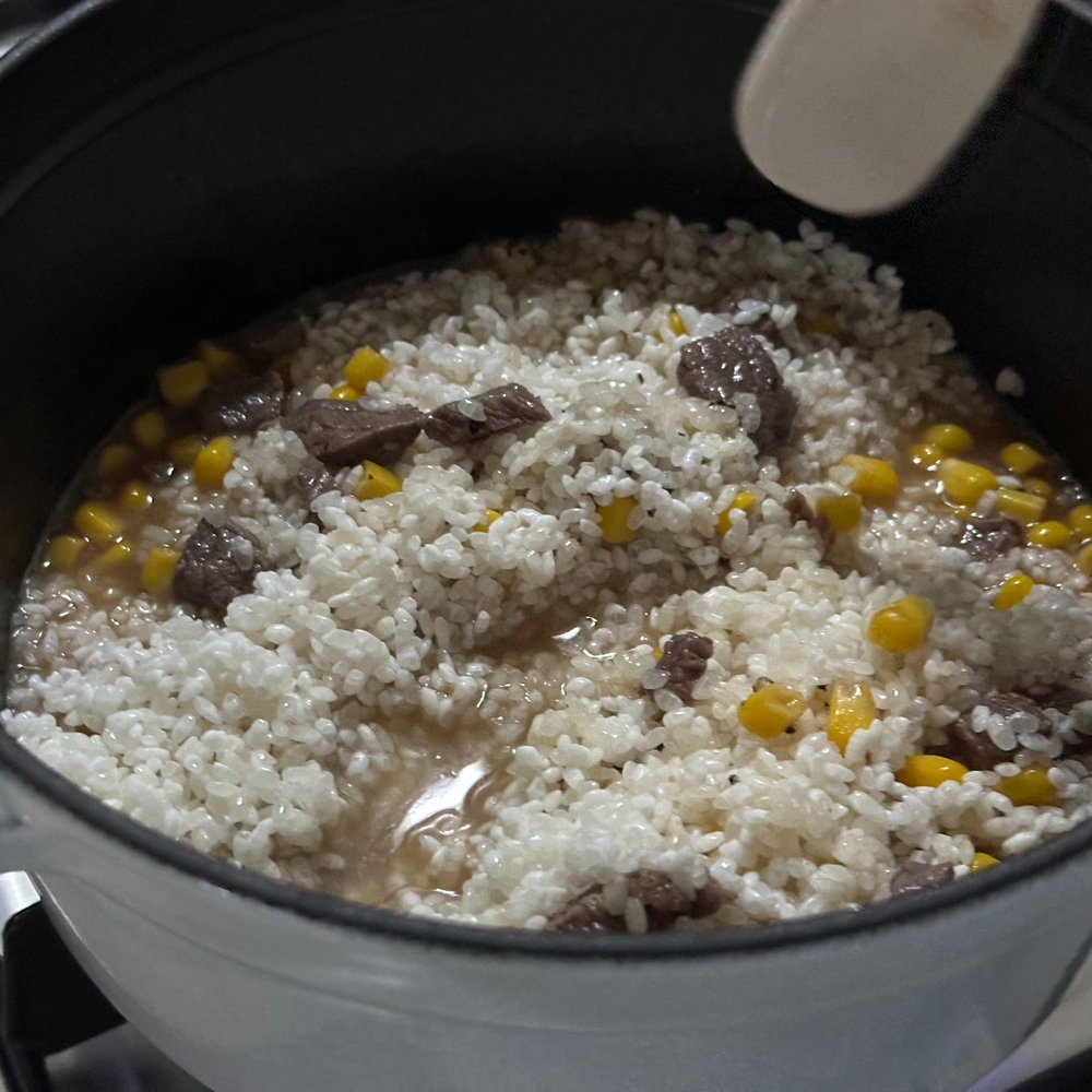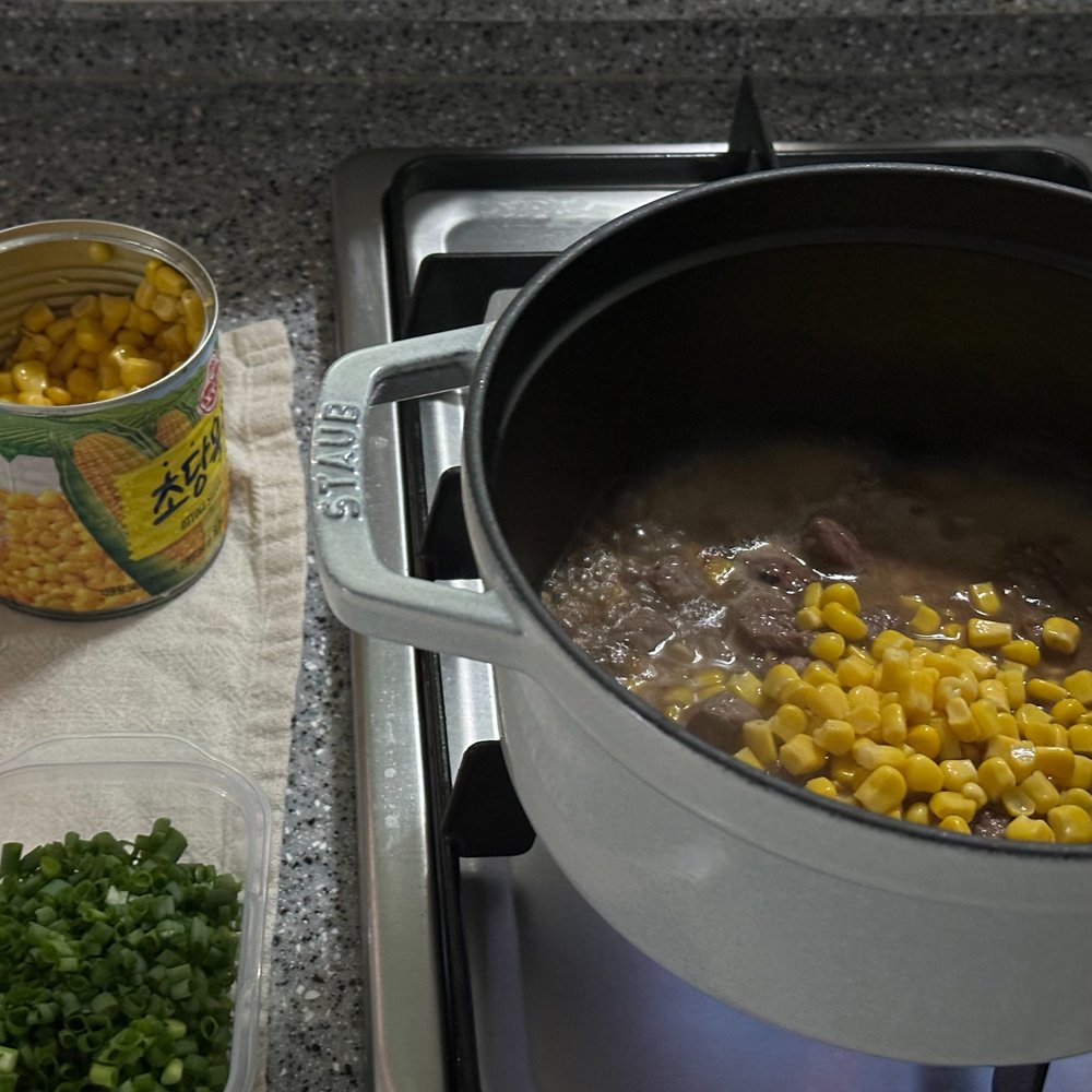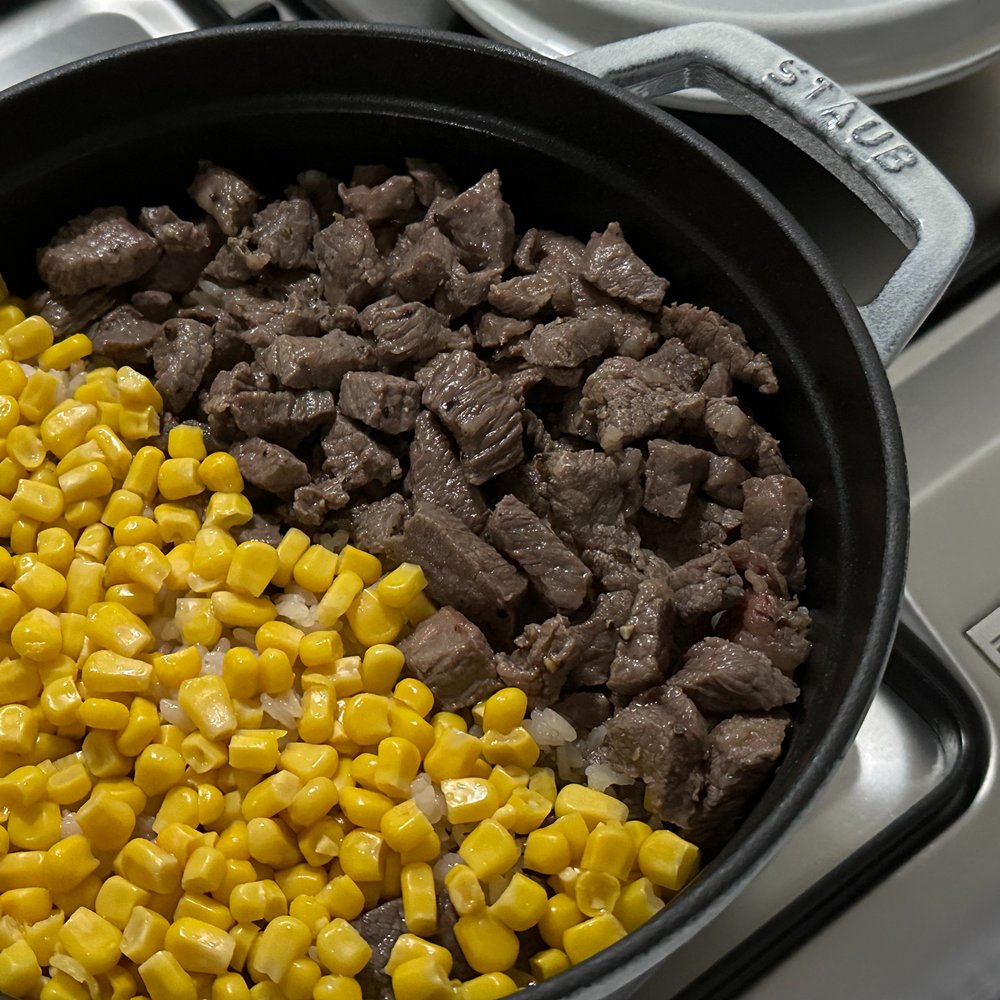 5. 15분 정도 기다려준 후 소고기와 옥수수를 마저 올려 뜸 들여줍니다.