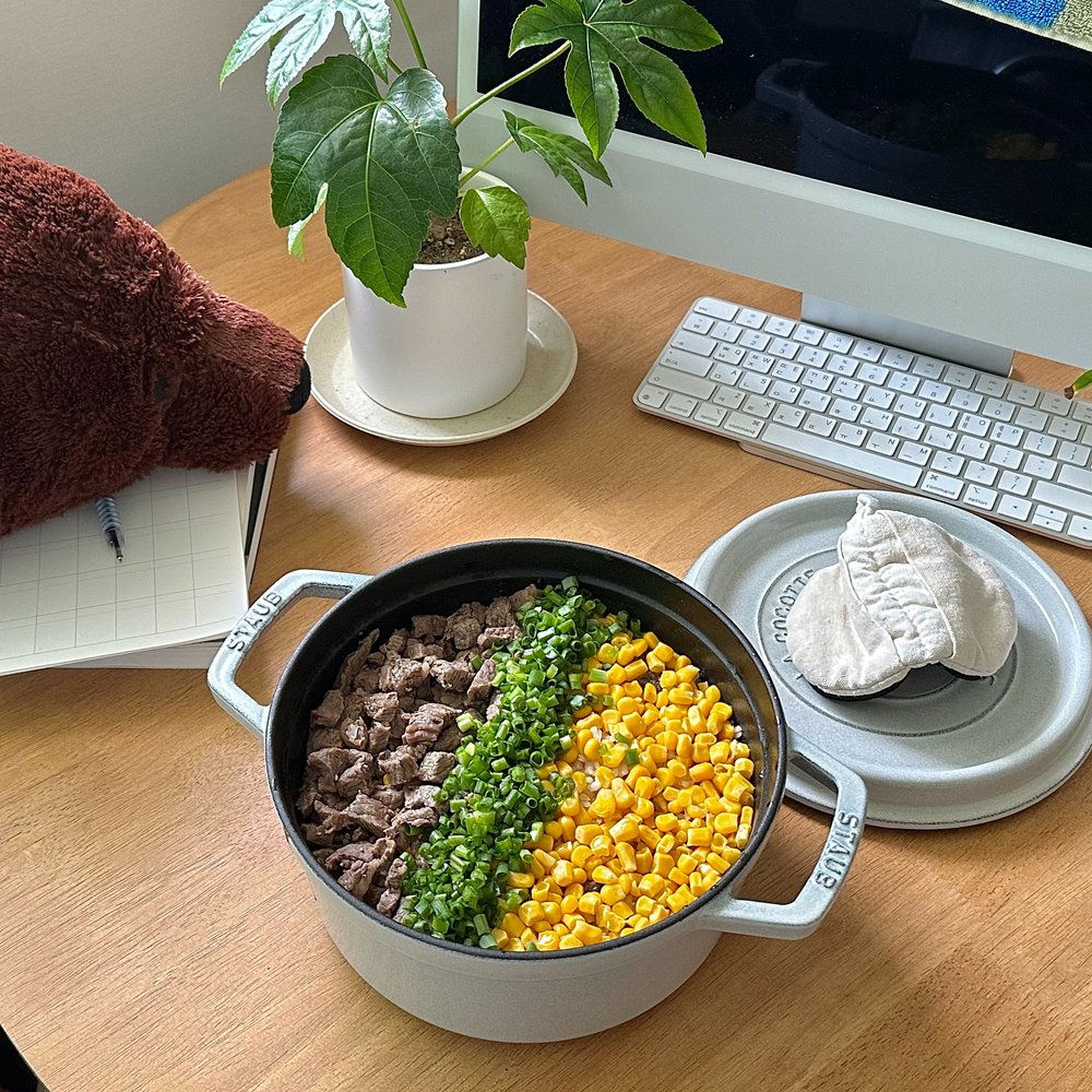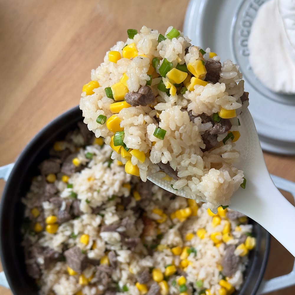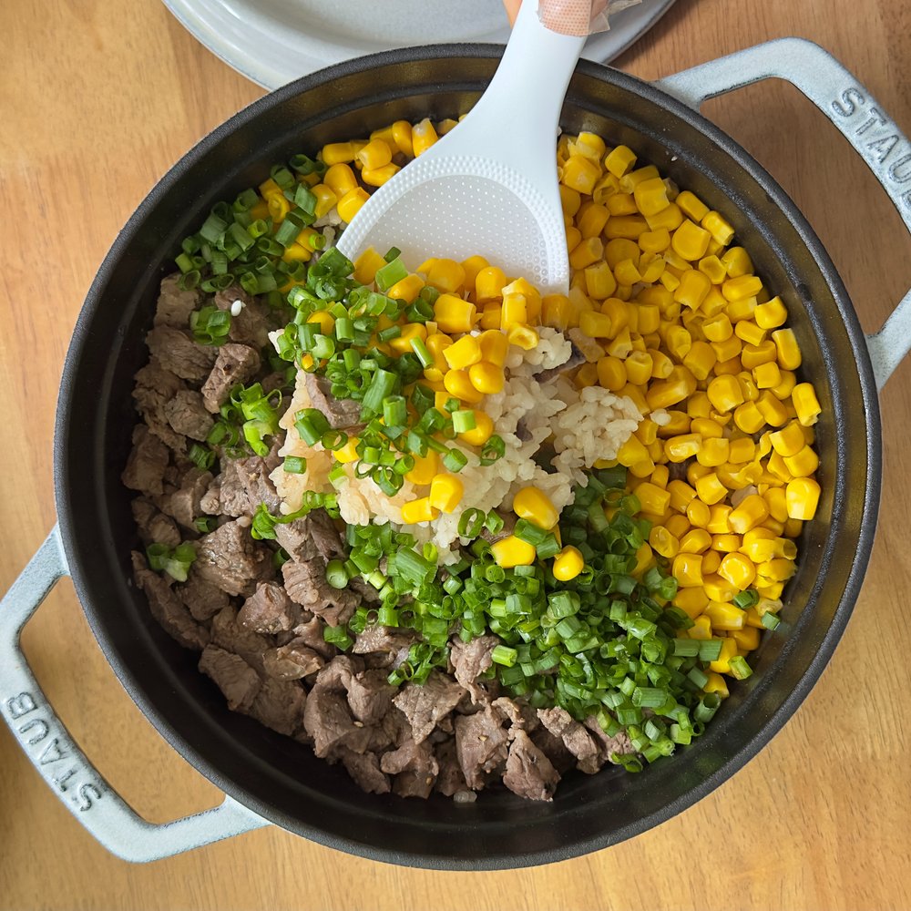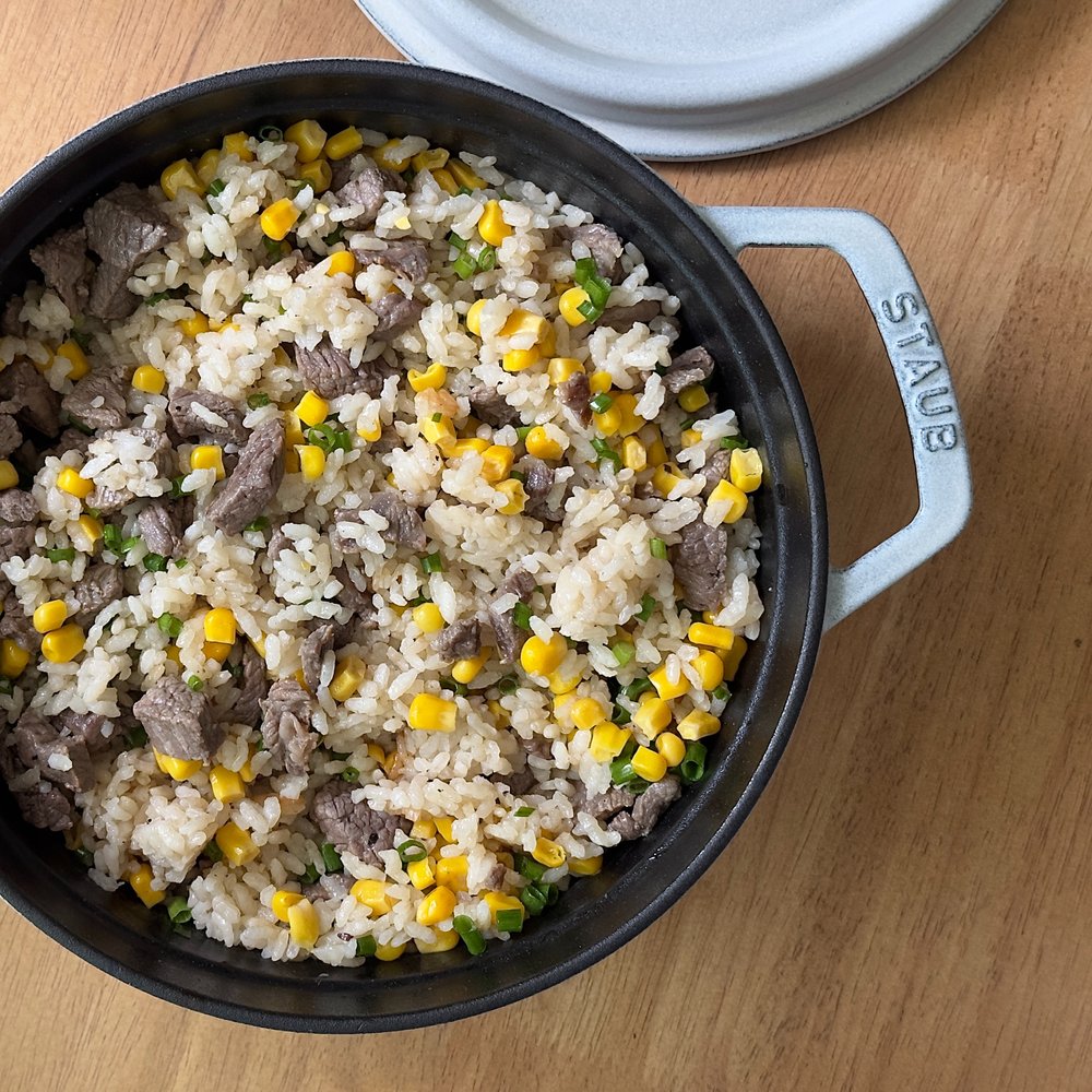 이런 날씨에 떠오르는 온기 가득한 한 끼 식사, 솥밥입니다. 쯔유로 양념한 풍미 깊은 소고기와 달달하면서 톡톡 터지는 옥수수가 정말 잘 어우러져요. 특히나 달달하고 짠 '단짠단짠' 조합이 예술이랍니다?