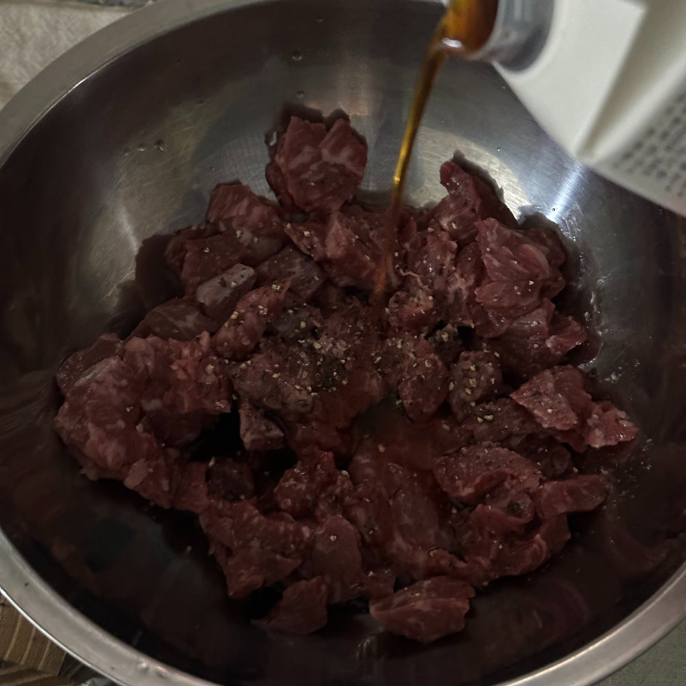 1. 냄비에, 쯔유에 재워둔 소고기를 구워줍니다.