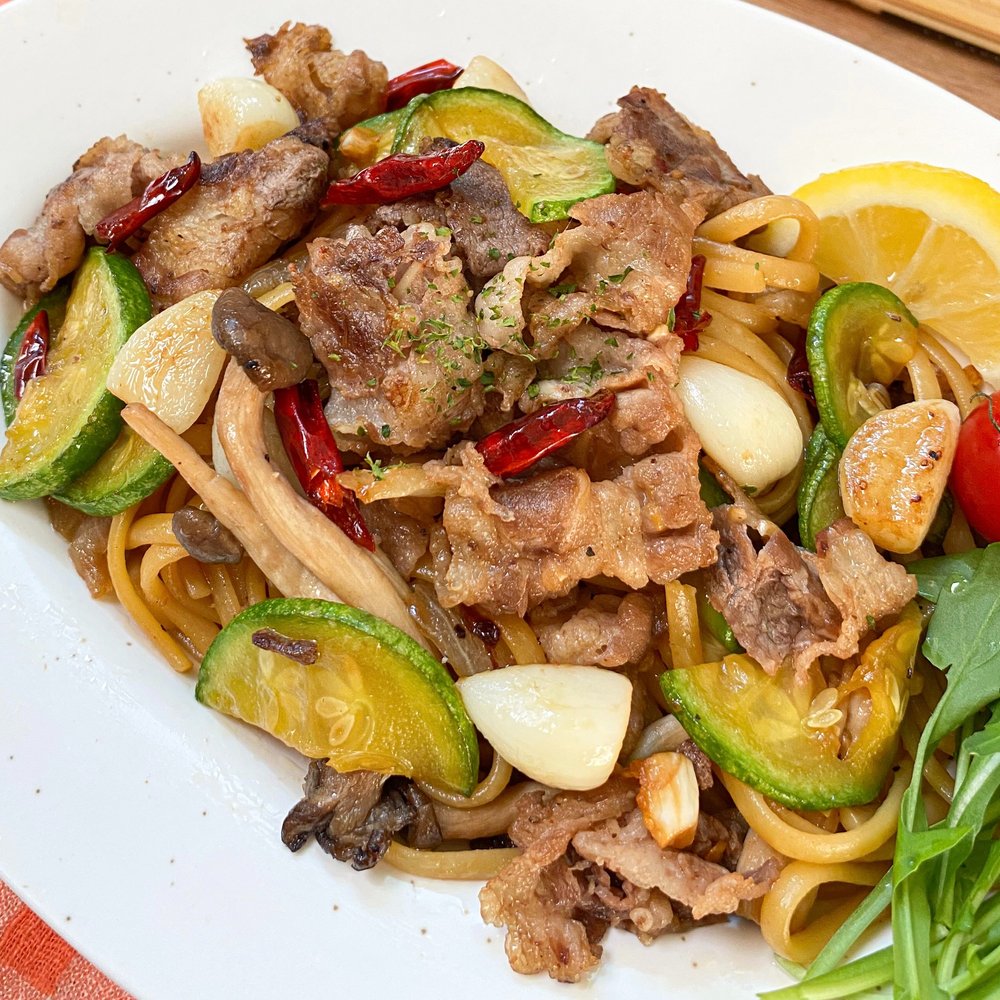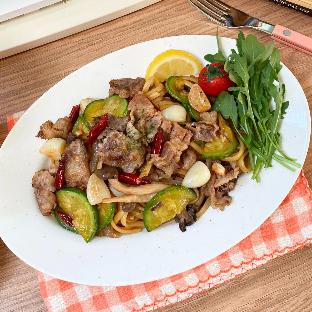 1. 먼저 끓는 물에 스파게티면을 8~9분간 잘 삶아주어요. 그동안 후라이팬에 우삼겹을 잘 구워내 덜어 놓고, 편 마늘 / 애호박 / 페퍼론치노를 넣고 잘 볶아줍니다.