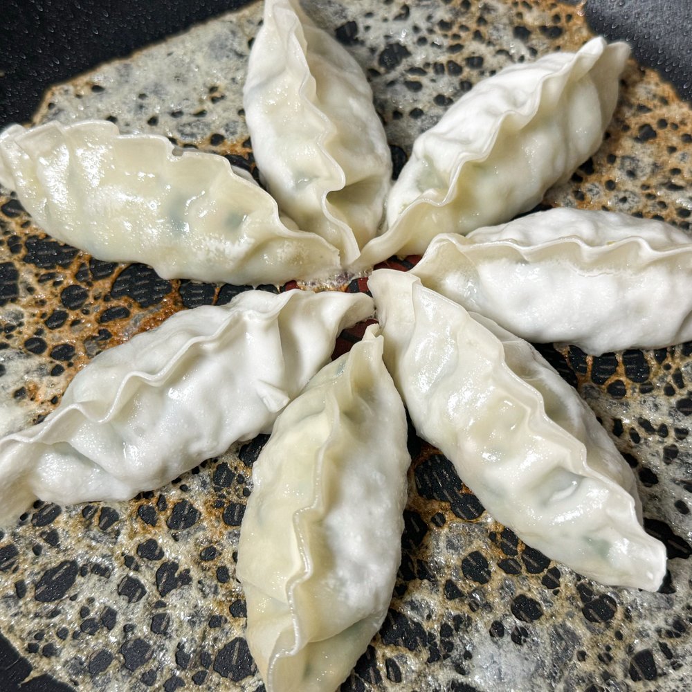 1. 기름 두른 팬에 동그랗게 만두를 두고, 중약불에 3분 정도 익혀 줍니다.