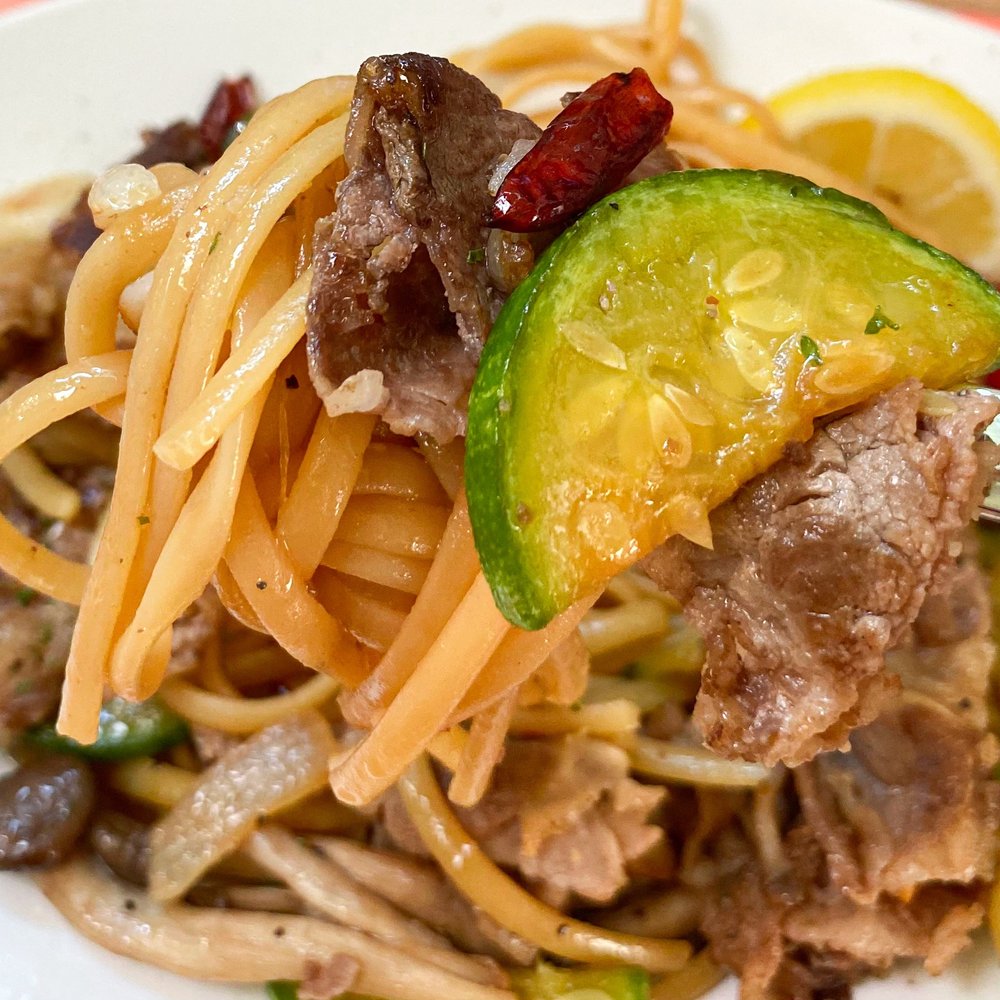 2. 잘 익은 스파게티면과 소스(간장 2, 굴소스 1/2, 설탕 1/2, 후추, 다진 마늘 1/2), 구운 우삼겹살, 면수 소량을 넣고 휘리릭 볶아주면 끝이에요.