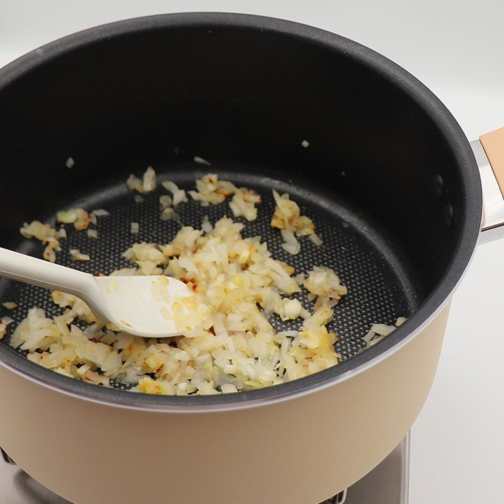 2. 올리브오일 두른 팬에 마늘과 다진 양파를 볶아줍니다.