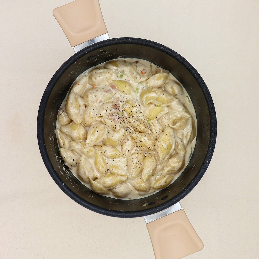 - 면을 넣고 한번 끓으면 약불로 줄여 뭉근하게 졸여줘야 면에 크림이 잘 배어들어요.