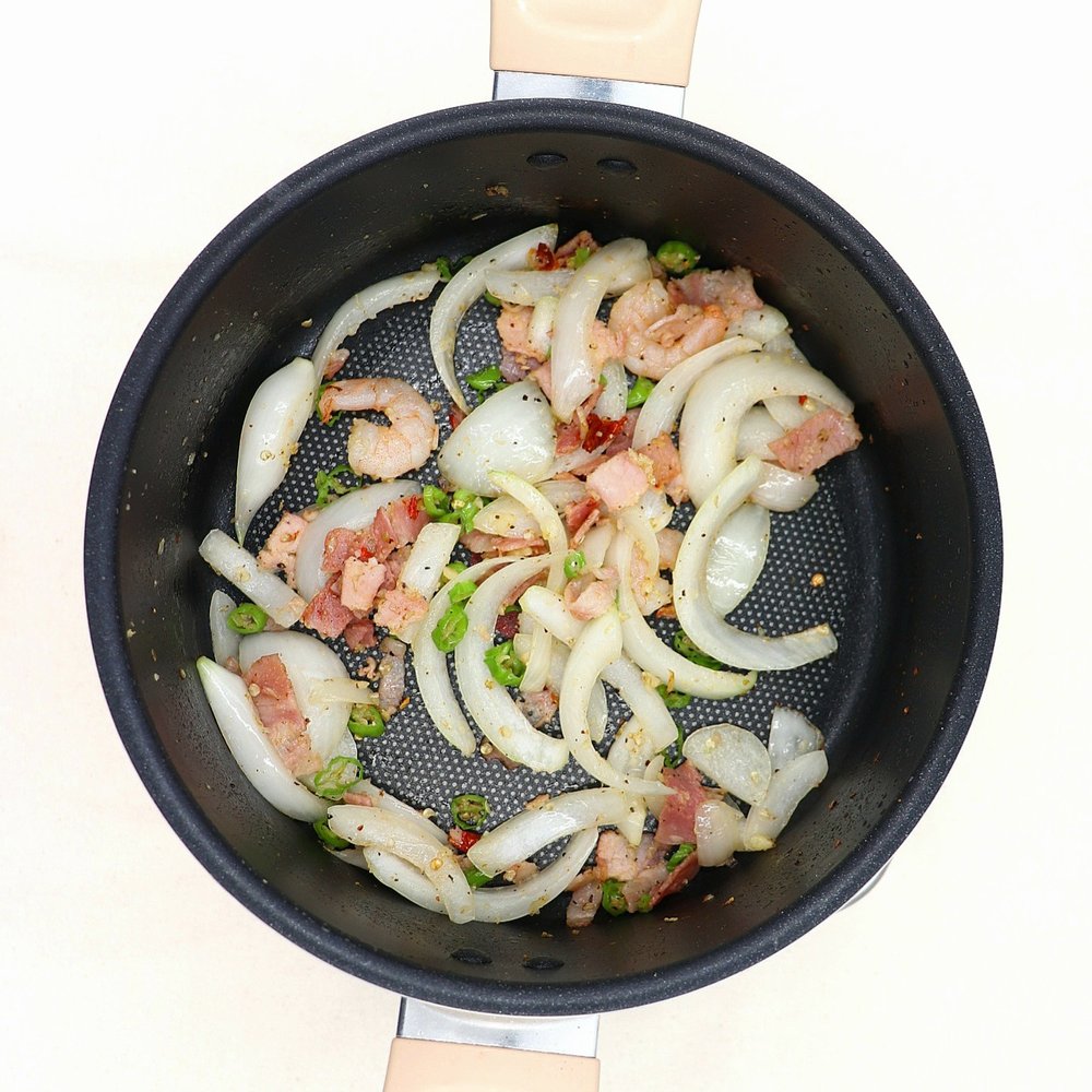 2. 올리브오일 두른 팬에 마늘, 페페론치노 먼저 볶고, 양파, 새우, 베이컨, 청양고추, 후춧가루 넣어 볶아줍니다.