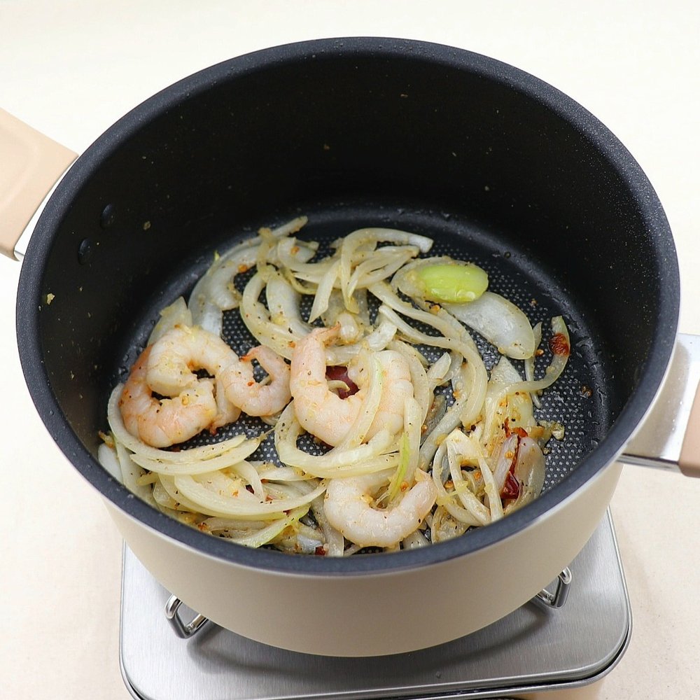 4. 얇게 썬 양파와 새우를 같이 넣고 볶아주다가 후춧가루도 뿌려줍니다.