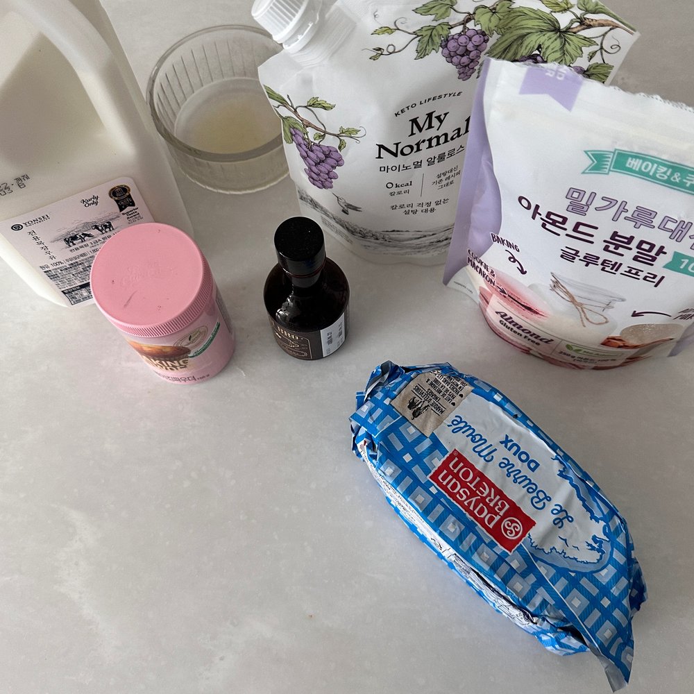 요거트 150g, 크림치즈 50g, 계란 1개, 바닐라익스트랙 1/2ts, 아몬드 가루 35g, 알룰로스 50g, 베이킹파우더 1/2ts, 소금 약간