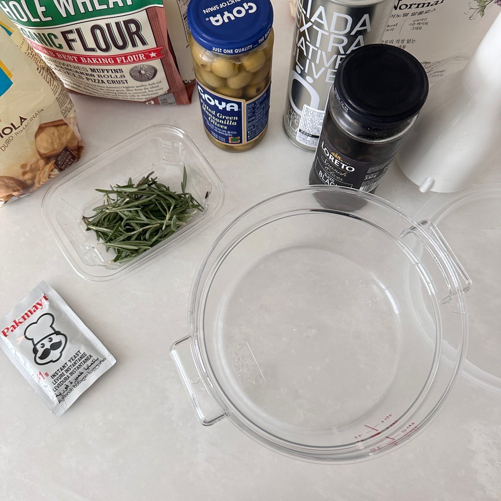 강력분 300g, 드라이 이스트 3g, 알룰로스 3g, 소금 5g, 올리브오일 20g, 미지근한 물 250g