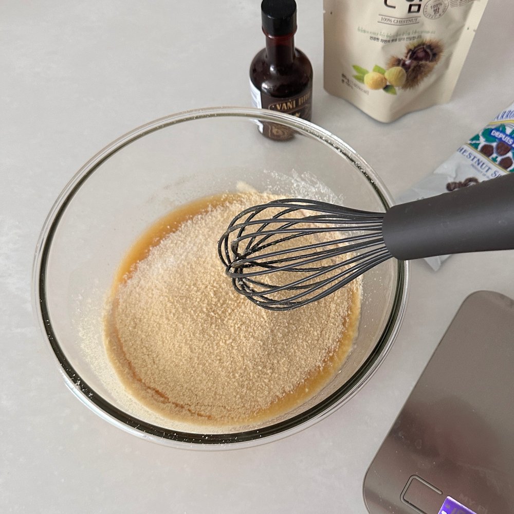 2. 달걀 2개 풀어 밤 페이스트에 섞고, 녹인 버터와 알룰로스를 섞어줍니다.