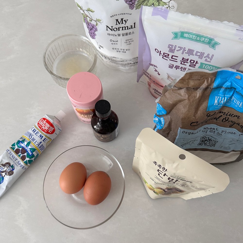 아몬드 분말 60g, 알룰로스 1Ts, 계란 1개, 버터 30g, 우유 2Ts, 베이킹파우더 1/3ts
