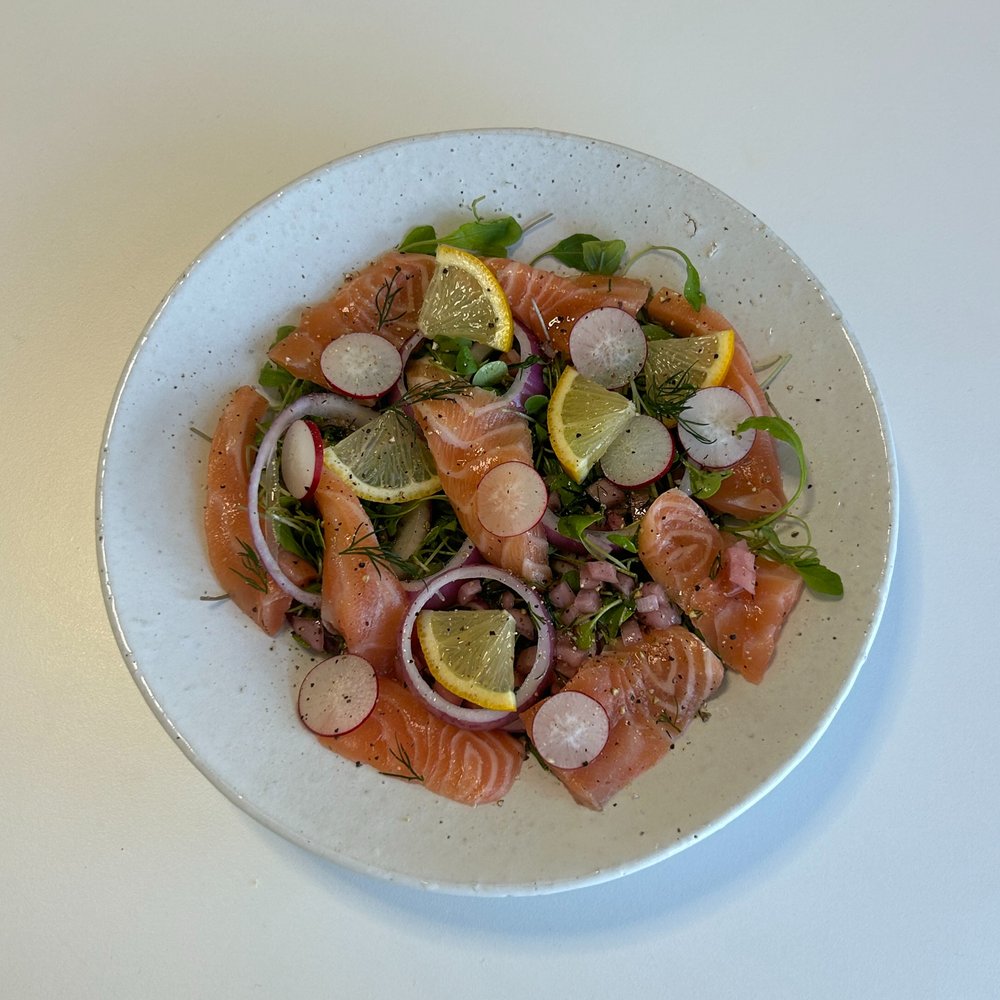 그래서 전 베이비루꼴라, 래디시, 딜을 곁들여 근사한 원플레이트 연어 샐러드를 만들어보았어요🥗
