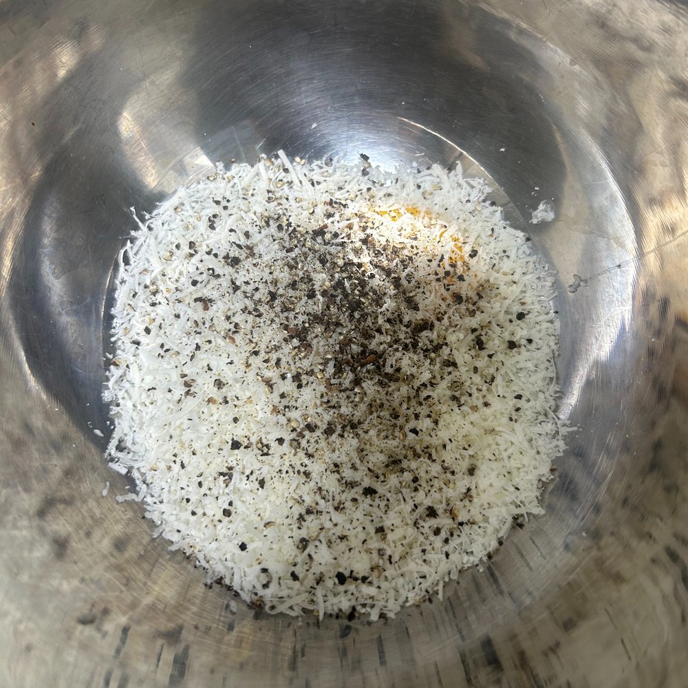 3️⃣ 계란 노른자 3알에 페코리노 로마노 치즈를 가득 갈아 넣고 흑후추 갈아 넣어 섞어줍니다.