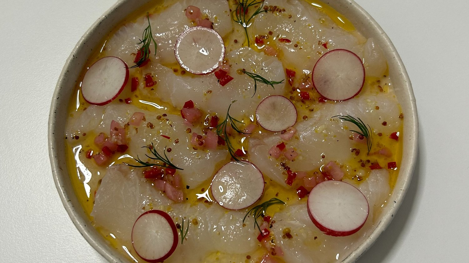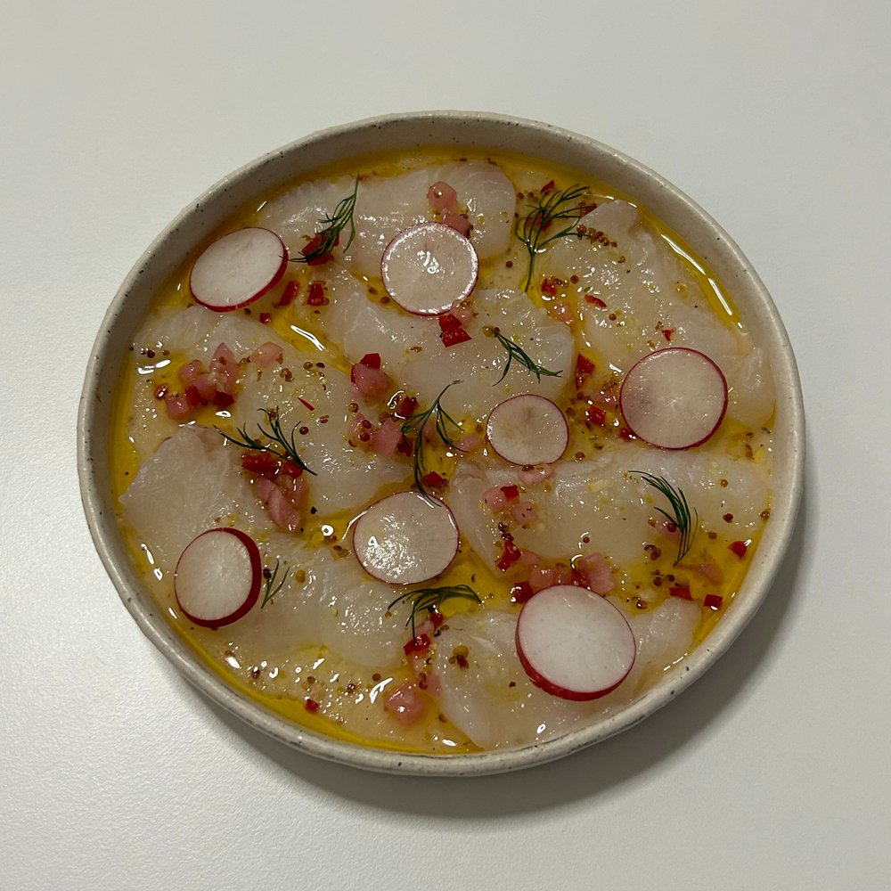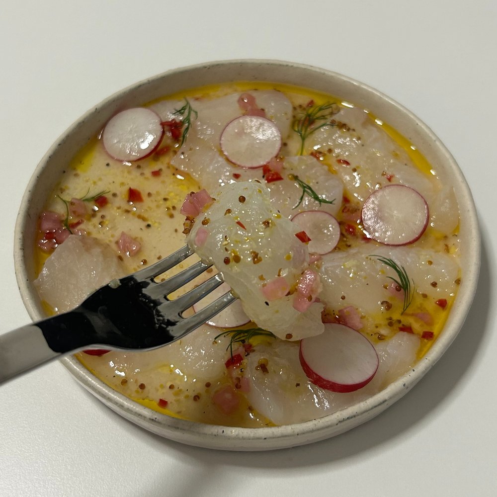 광어회, 딜, 홀그레인 머스터드, 다진 마늘, 올리브유, 레몬즙, 올리고당, 후추, 홍고추, 적양파 피클, 화이트 발사믹 식초, 소금, 래디시