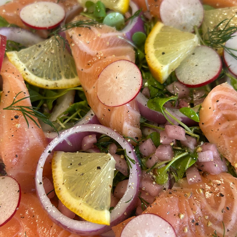 베이비루꼴라, 래디시, 딜, 레몬, 연어, 양파, 올리브유, 화이트 발사믹 식초, 적양파 피클