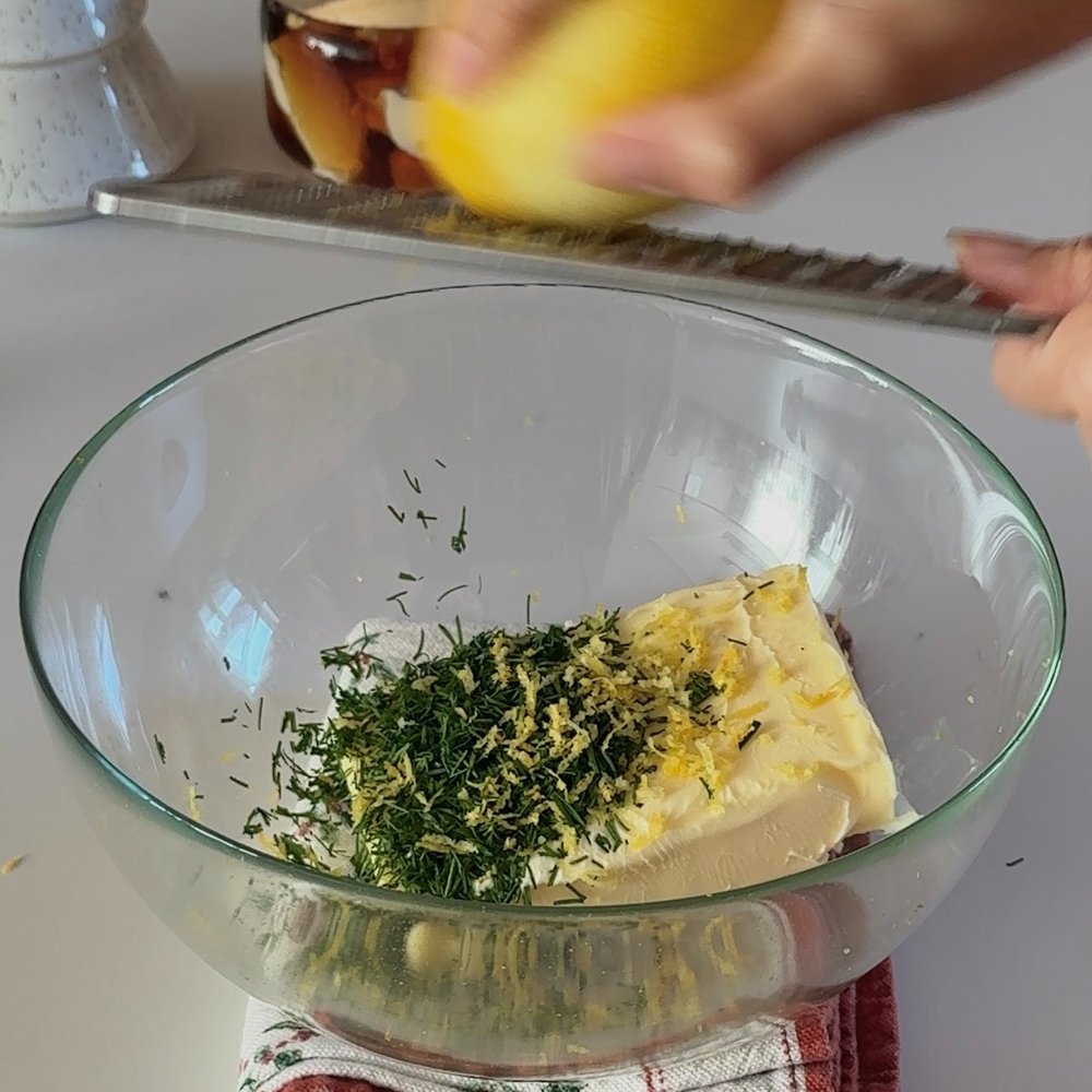좋아하는 버터에 딜을 잘게 썰어 넣고 레몬 제스트를 갈아 넣은 다음 잘 섞어주면 완성!