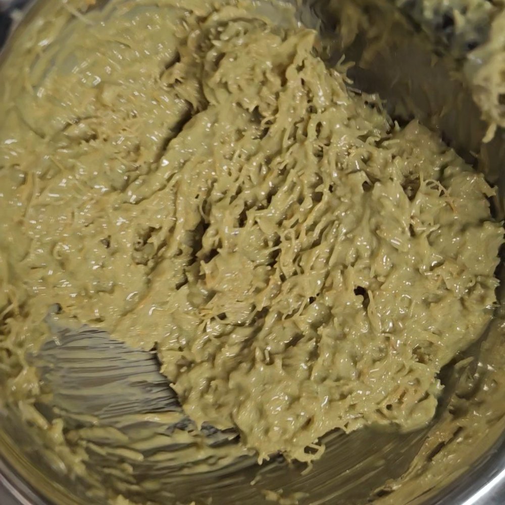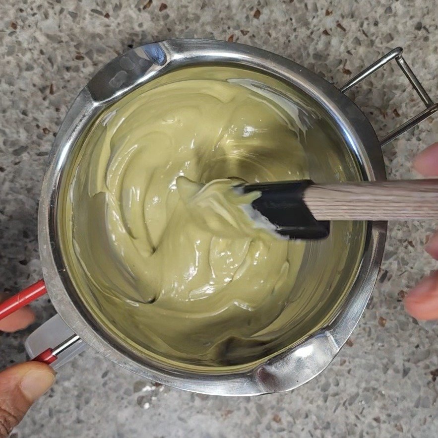 2. 볶은 카다이프 면은 한 김 식힌 뒤 피스타치오 크림과 섞어주세요. 이때 화이트초콜릿을 녹여 피스타치오 크림과 1:2 비율로 섞어서 사용하면 더 맛있어요😋