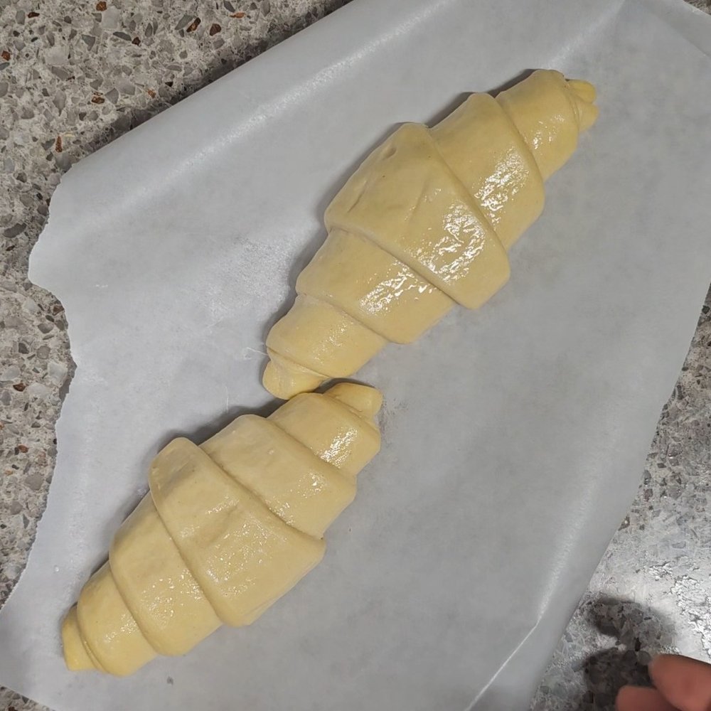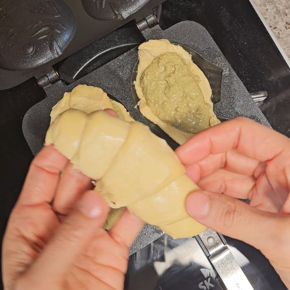 ✓ 붕어빵 모양 팬에 오일 스프레이로 오일을 가볍게 묻혀주고 👉 실온에 해동한 크루아상 생지를 가위로 반 갈라 펴준 뒤 붕어빵 팬에 깔아주세요.