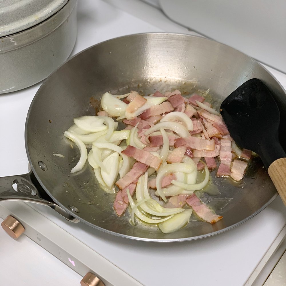 2. 베이컨이 살짝 노릇해지면 채 썬 양파를 놓고 같이 구워주세요.
