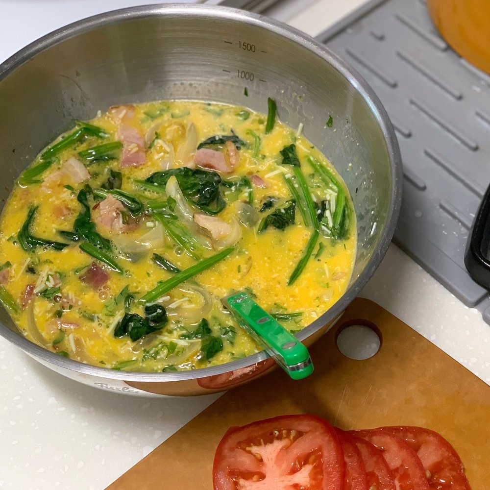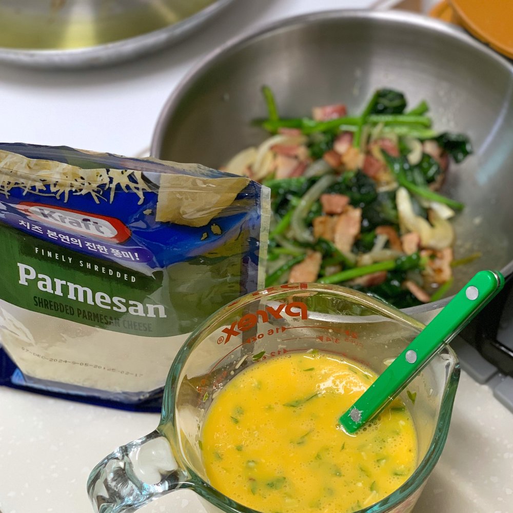 베이컨 3줄, 계란 6알, 우유 50ml, 시금치 100g, 양파 반 개, 토마토 1개, 파마산 치즈, 모짜렐라 치즈, 소금 & 후추, 파슬리 약간, 버터, 올리브오일