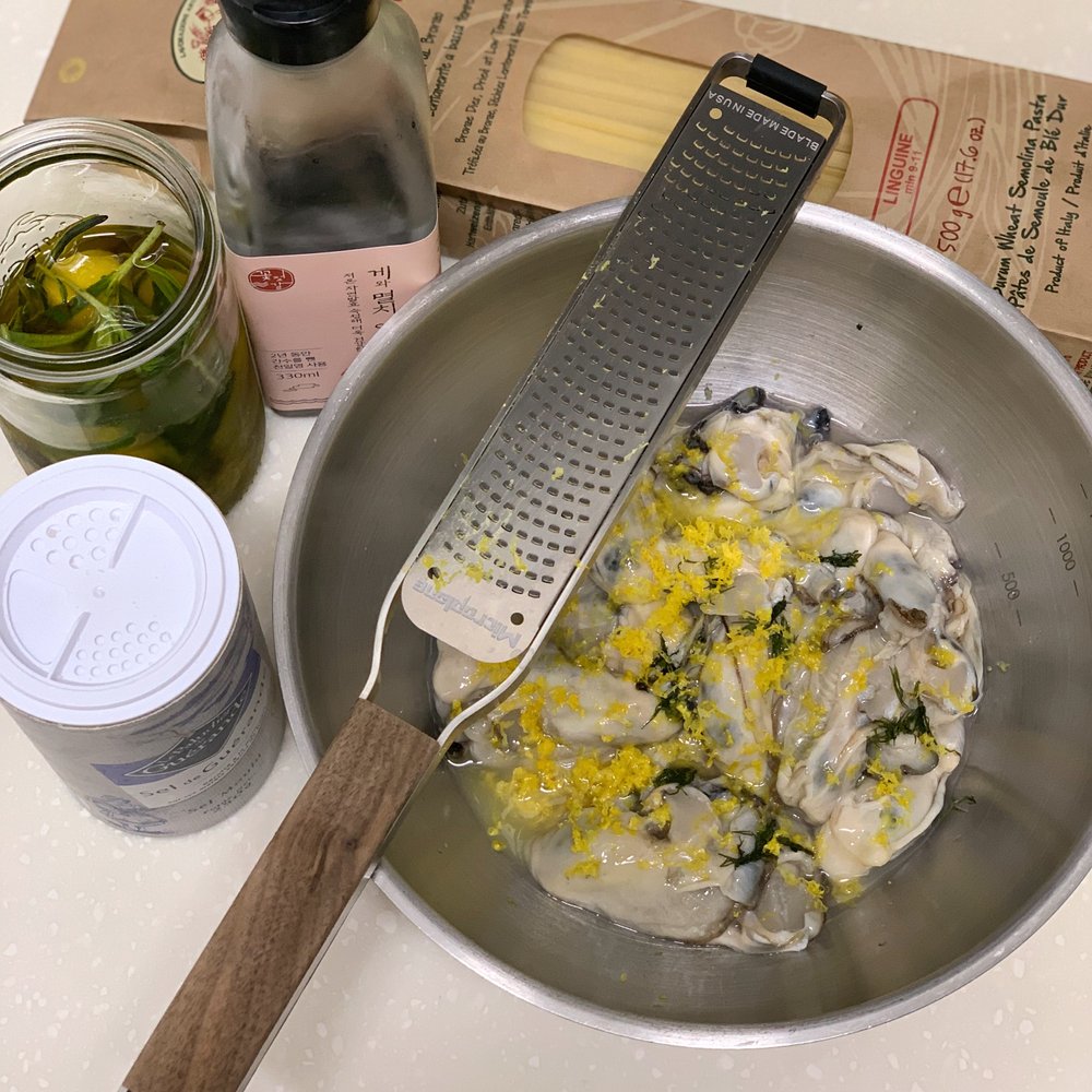 굴 200g 2팩(총 400g 사용), 링귀네면(루스티켈라 추천), 올리브오일, 대파 1대(흰 부분), 알배추(2장), 마늘 4알, 그린 올리브 3알, 레몬 반개, 깻잎 3장, 양파 1/3개, 루꼴라 한두 줌, 청양고추(또는 페퍼론치노), 치킨 스톡 아주 약간, 꽃게 액젓 1T, 쯔유 1T, 식초 1T, 소금 약간, 그뤼에르 치즈