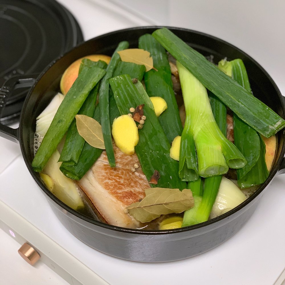돼지고기 1kg (사태+앞다릿살 함께 사용하는 거 추천), 양파 반 개, 마늘 8알, 통후추 8알, 정향 작은 거 1~2조각, 대파 1개, 사과 1개, 생강 작은 거 1톨, 월계수 잎 2~3개, 물 (냄비에 2/3 채울 정도), 굵은소금 1T