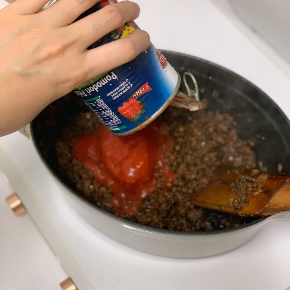 5. 토마토 페이스트 2T, 홀 토마토 400g 한 캔을 넣고 으깨가면서 바글바글 끓여주세요.