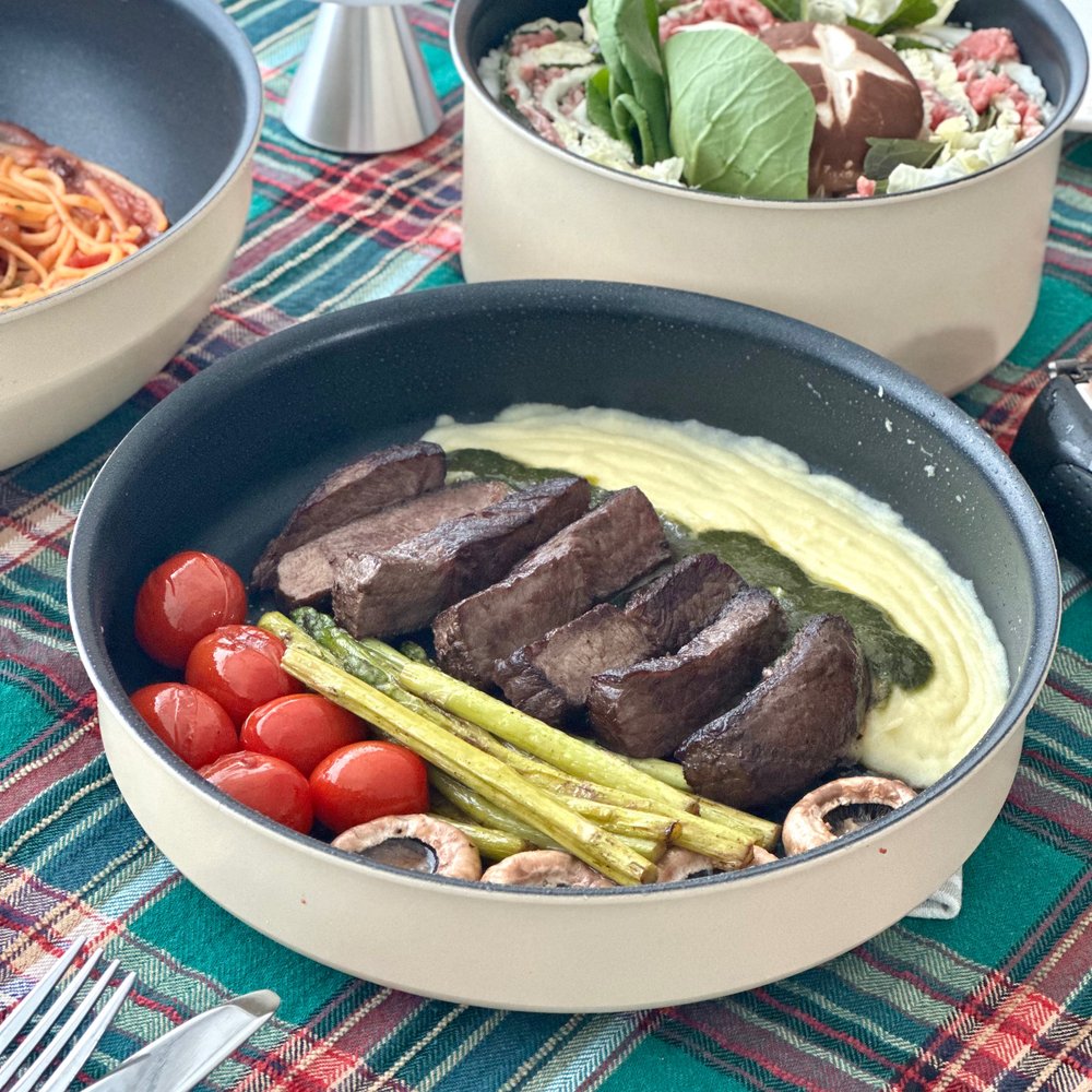 매쉬드포테이토는 해동 시킨 후 팬에 부드러워질 때까지 저어서 익혀준 다음, 불을 끄고 그 위에 지미추리소스와 잘라둔 스테이크 올려주면! 식당에서나 볼법한 비쥬얼의 스테이크를 홈파티 메뉴로 간단하게 만들 수 있어요.