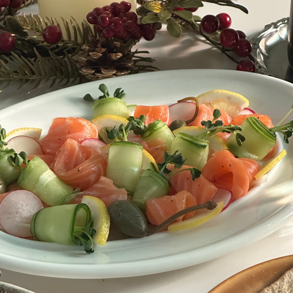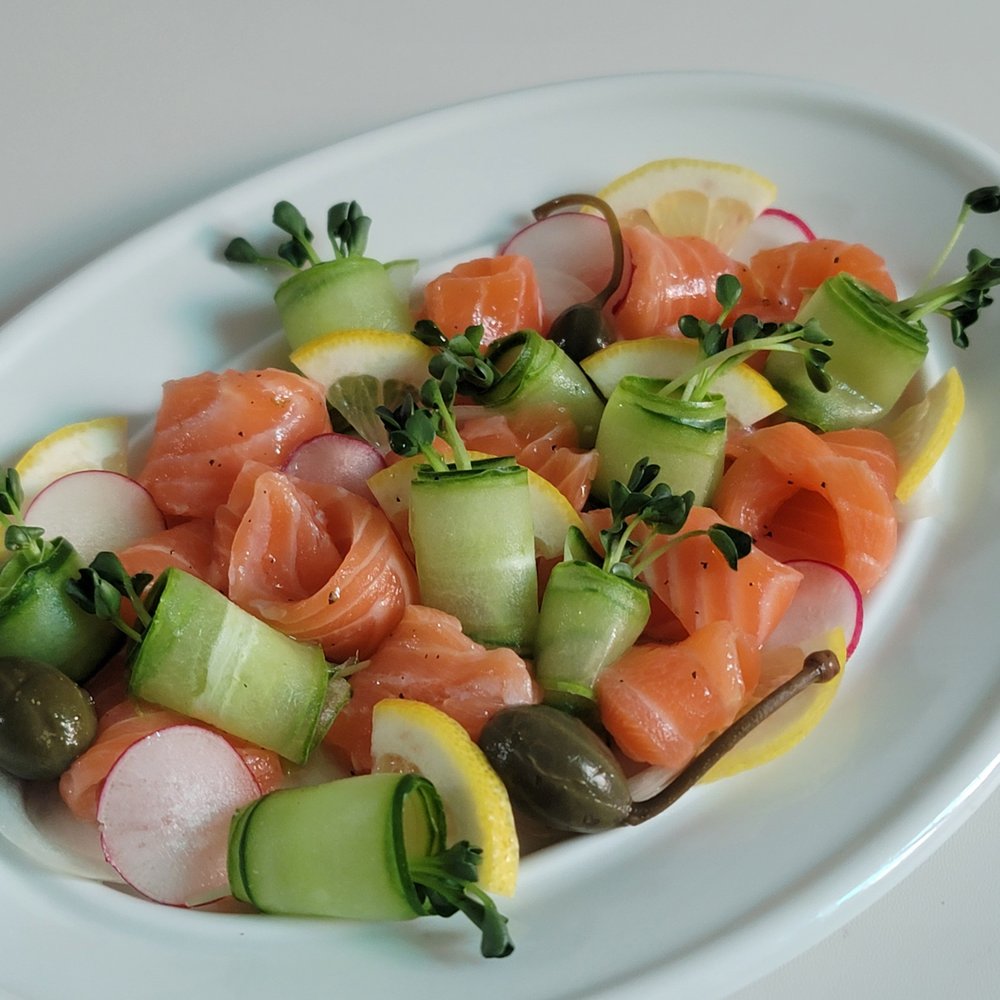 연어 150g, 오이 반 개, 무순 조금, 래디쉬 1개, 케이퍼베리 4개, 양파 1/6개, 슬라이스 레몬 1조각