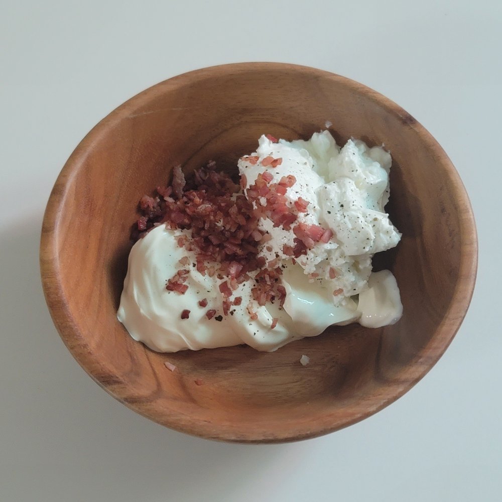 2. 크림치즈와 볶은 베이컨을 섞어주세요.