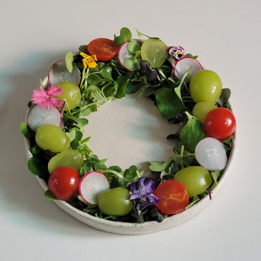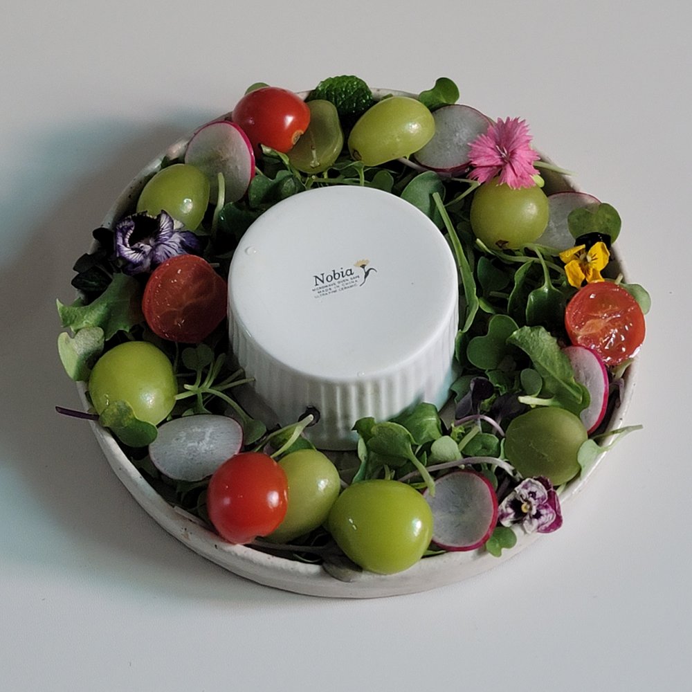 👩🍳 그릇에 작은 컵을 올리고, 주변에 어린잎 채소를 담고 딸기나 샤인머스캣, 토마토 등 과일을 올려주세요. 래디쉬와 식용 꽃으로 포인트를 주고 마지막에 컵을 빼면 예쁜 리스 샐러드 완성이에요.
