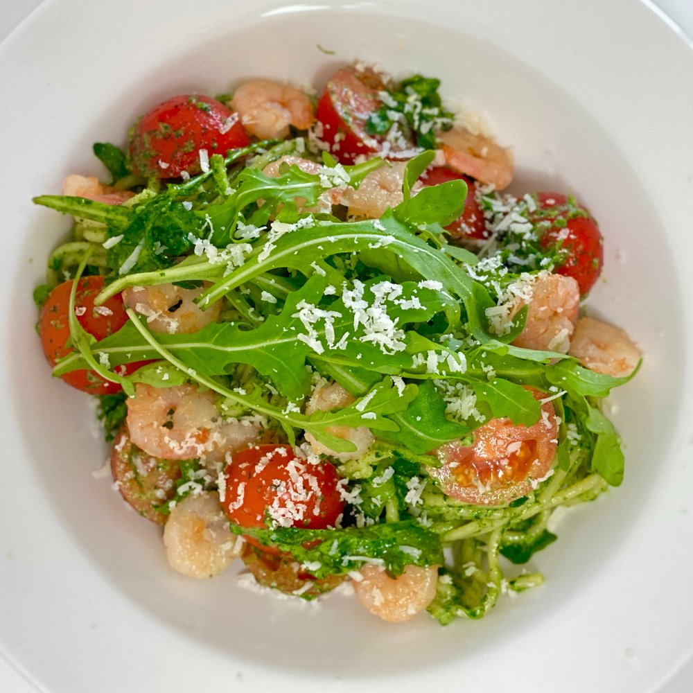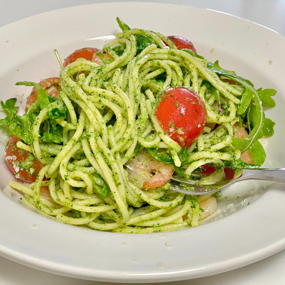 만든 페스토는 삶은 면에 버무려 새우와 토마토, 루꼴라를 넣고 바질 페스토 파스타를 만들었는데요. 갓 만든 페스토라 마트에 파는 것보다 싱그러운 초록빛이 살아 있어요💚