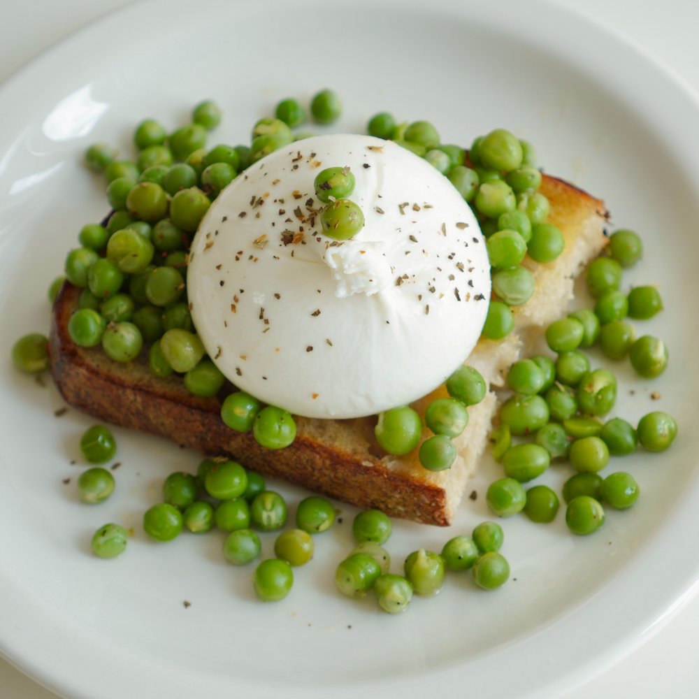타르틴 베이커리의 컨트리 하프 한 조각을 살짝 구워 부라타 치즈와 소스에 버무려둔 완두콩을 올리면 완성-!