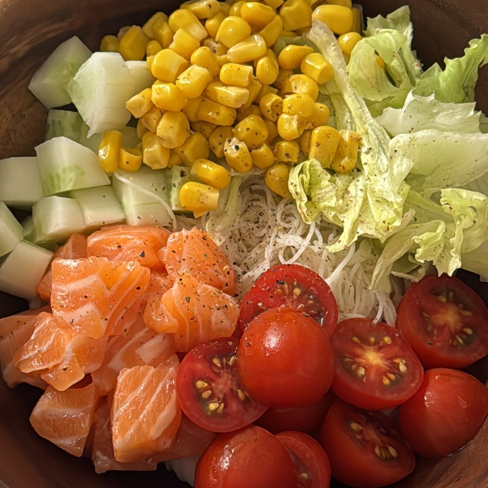 재료 : 두유면, 오이, 연어, 토마토, 양상추, 옥수수 콘, 샐러드 소스